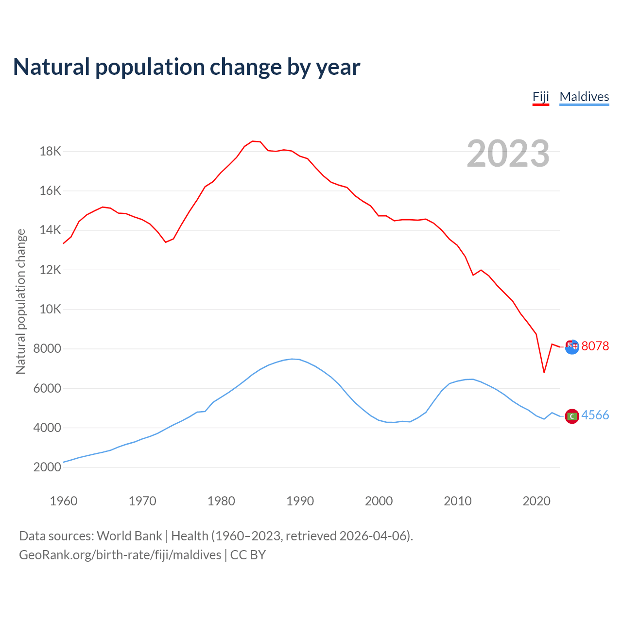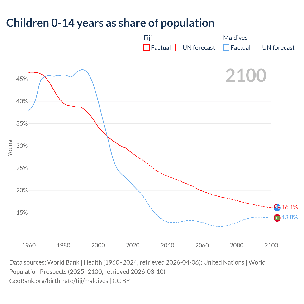 According to the latest available data on birth rates, the fertility rate in Fiji was 2.28 children per woman in 2023, compared to 1.58 in Maldives in 2023. The replacement level is considered to be 2.1 children per woman.