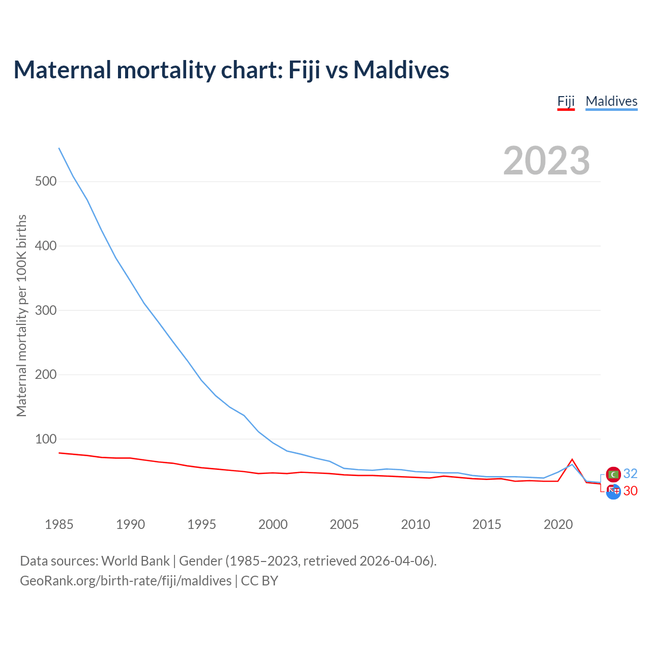 The maternal mortality rate, which is the probability of dying during childbirth or within 42 days of pregnancy termination, is 30 deaths per 100,000 live births in Fiji, compared to 32 deaths in Maldives.