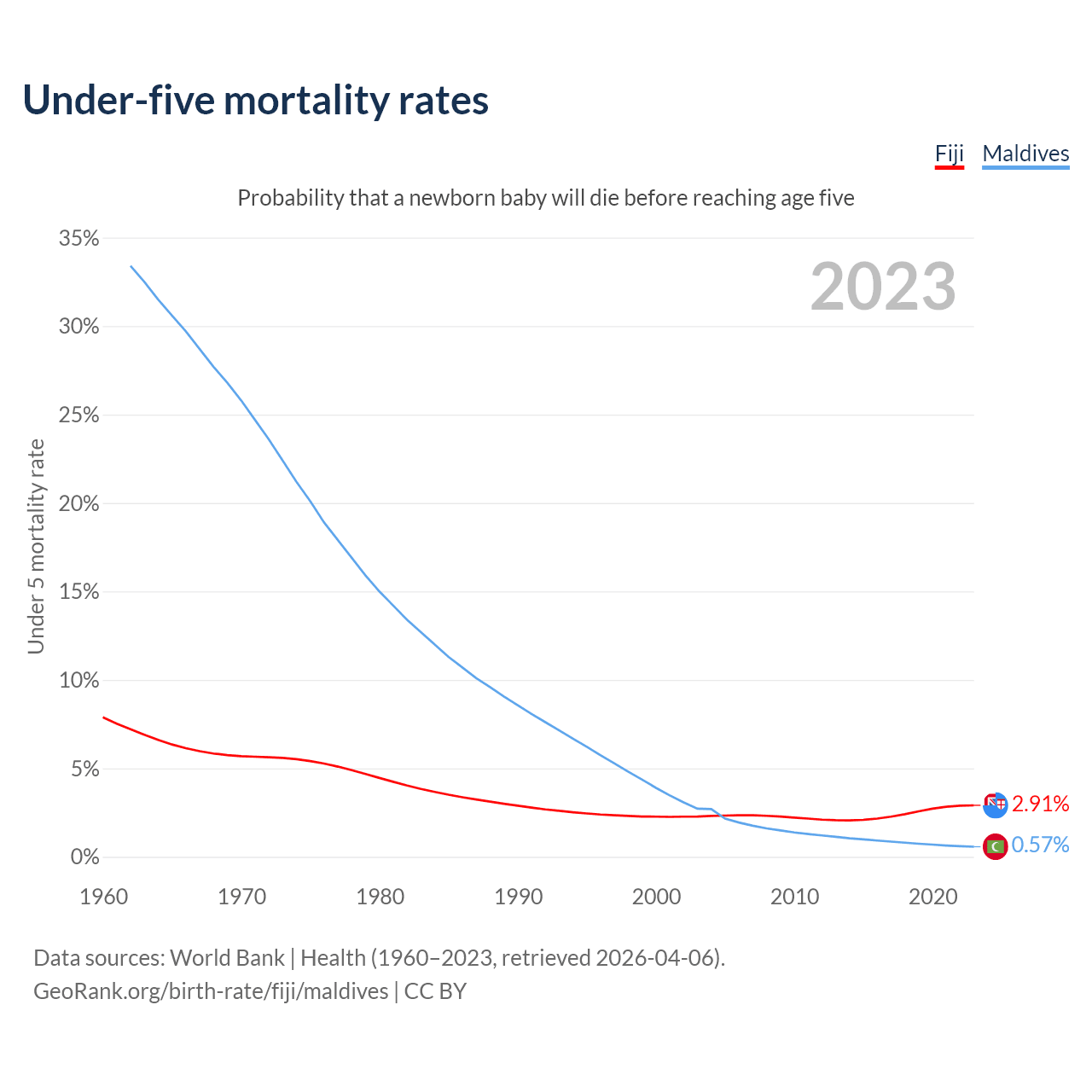 The chance that a newborn baby will die before reaching age five is 2.91% in Fiji and 0.57% in Maldives. Above is a chart with historical data on under-five mortality rates.