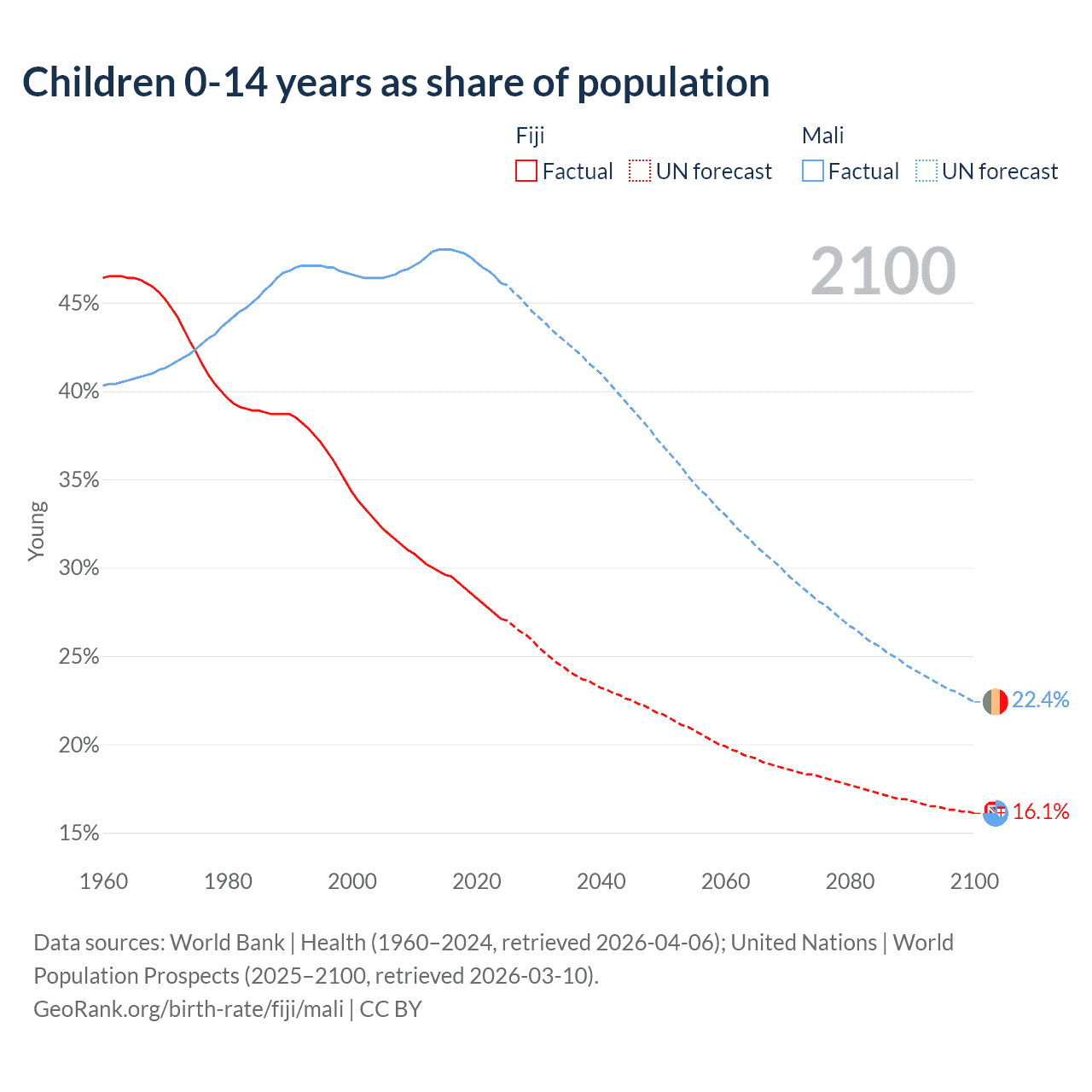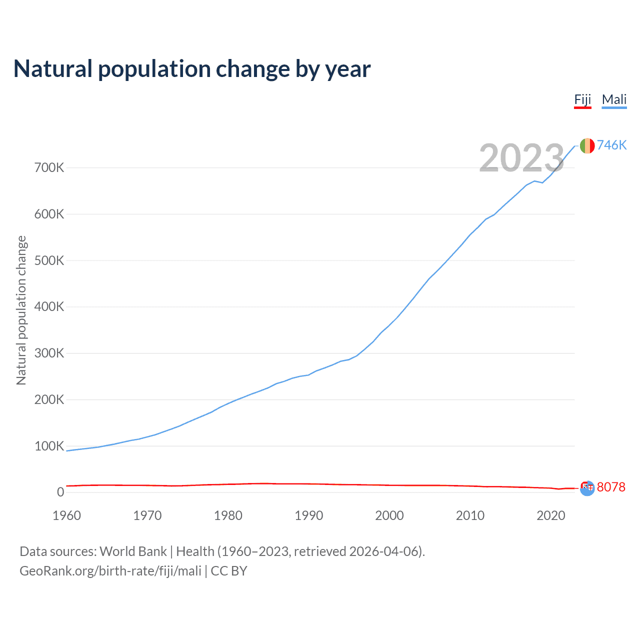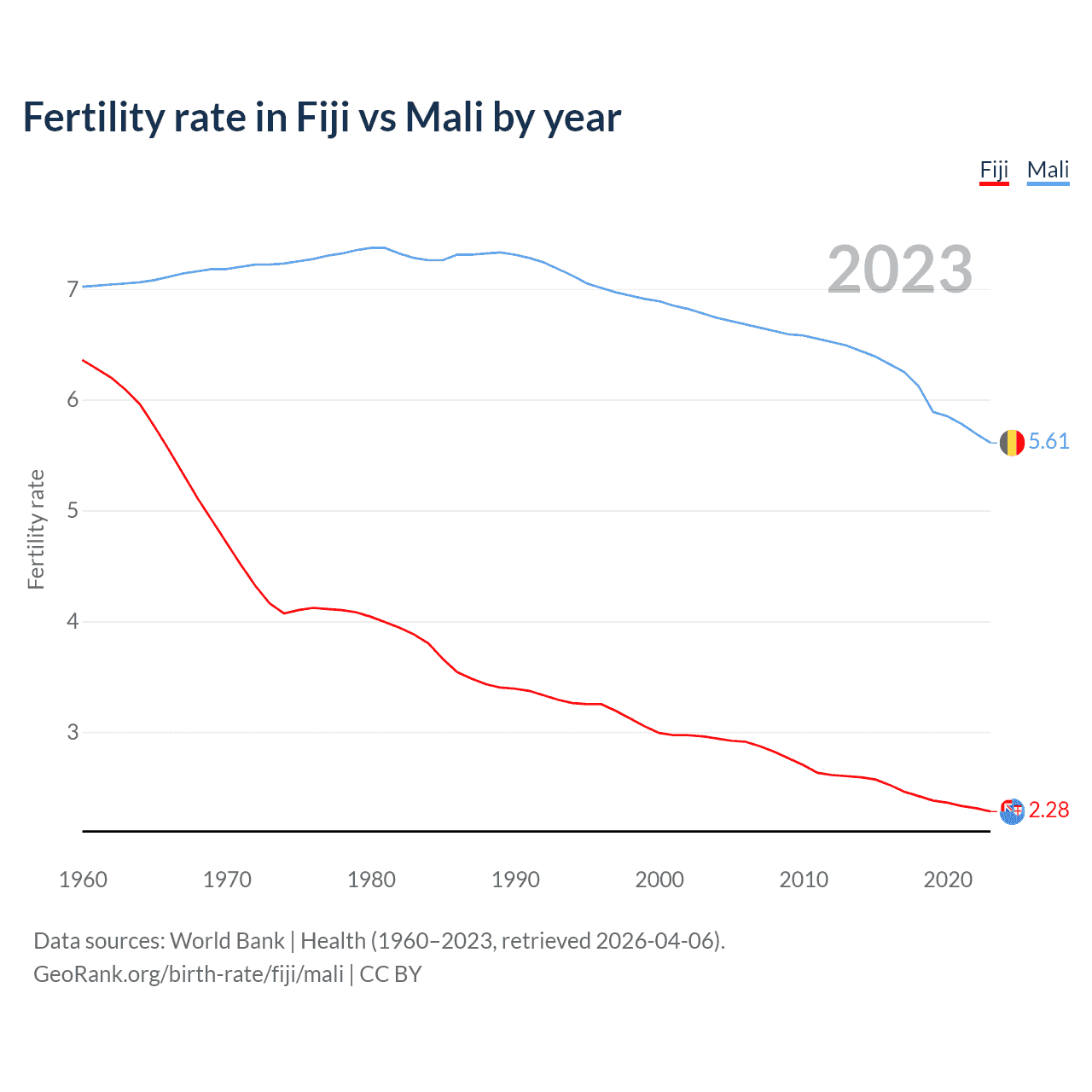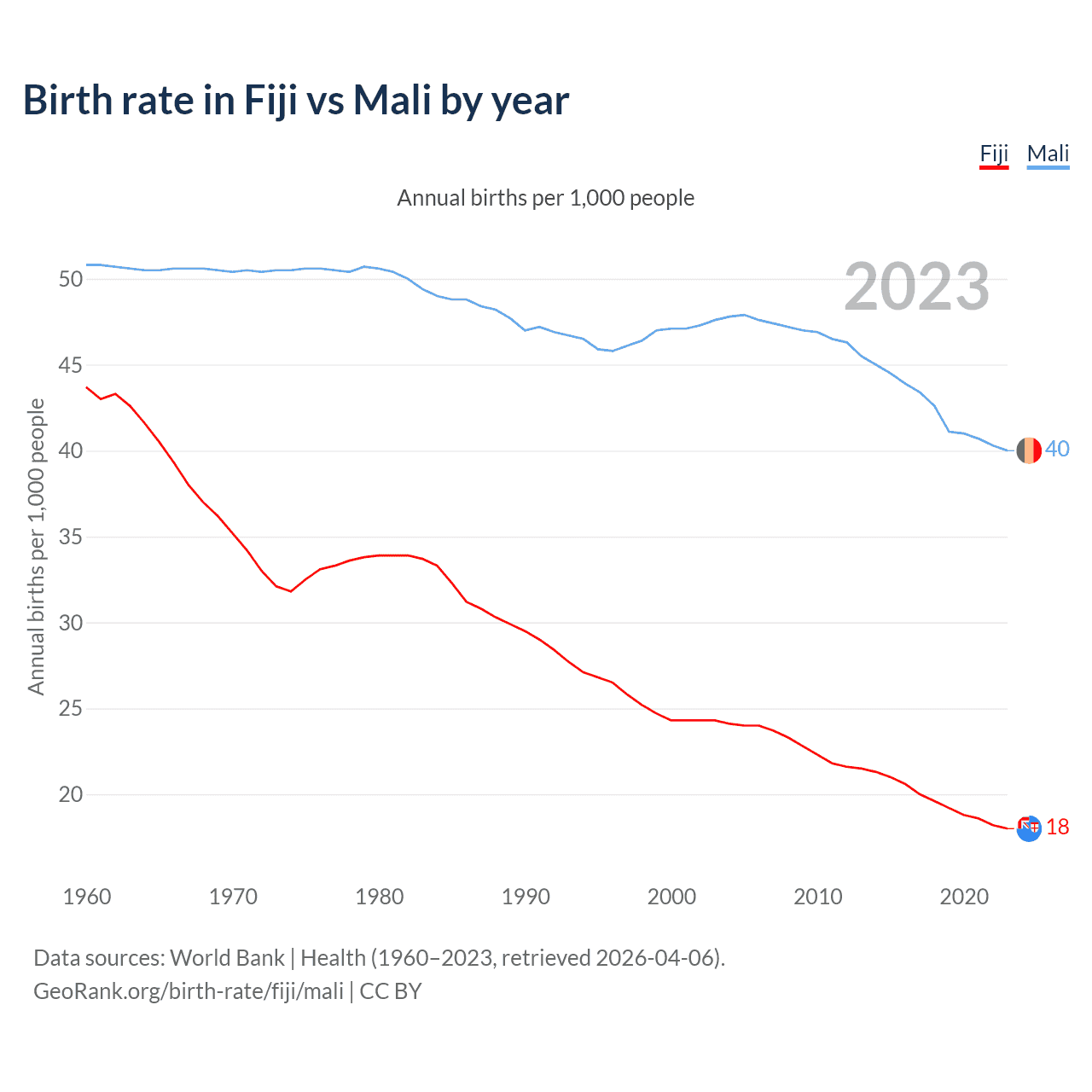 Fiji has an annual birth rate of 18 births per 1,000 people, compared to 40 for Mali. The average number of children a woman is expected to have during her lifetime — the fertility rate, is 2.28 in Fiji and 5.61 in Mali — 146.1% difference.
