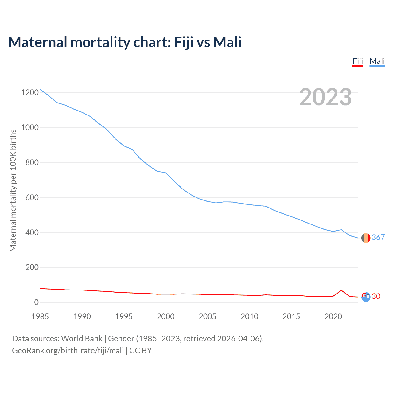 The maternal mortality rate, which is the probability of dying during childbirth or within 42 days of pregnancy termination, is 30 deaths per 100,000 live births in Fiji, compared to 367 deaths in Mali.