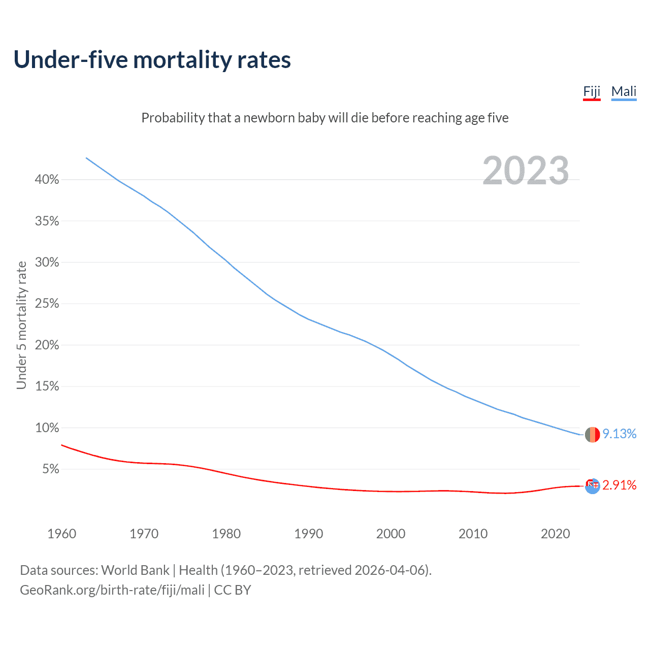 The chance that a newborn baby will die before reaching age five is 2.91% in Fiji and 9.13% in Mali. Above is a chart with historical data on under-five mortality rates.