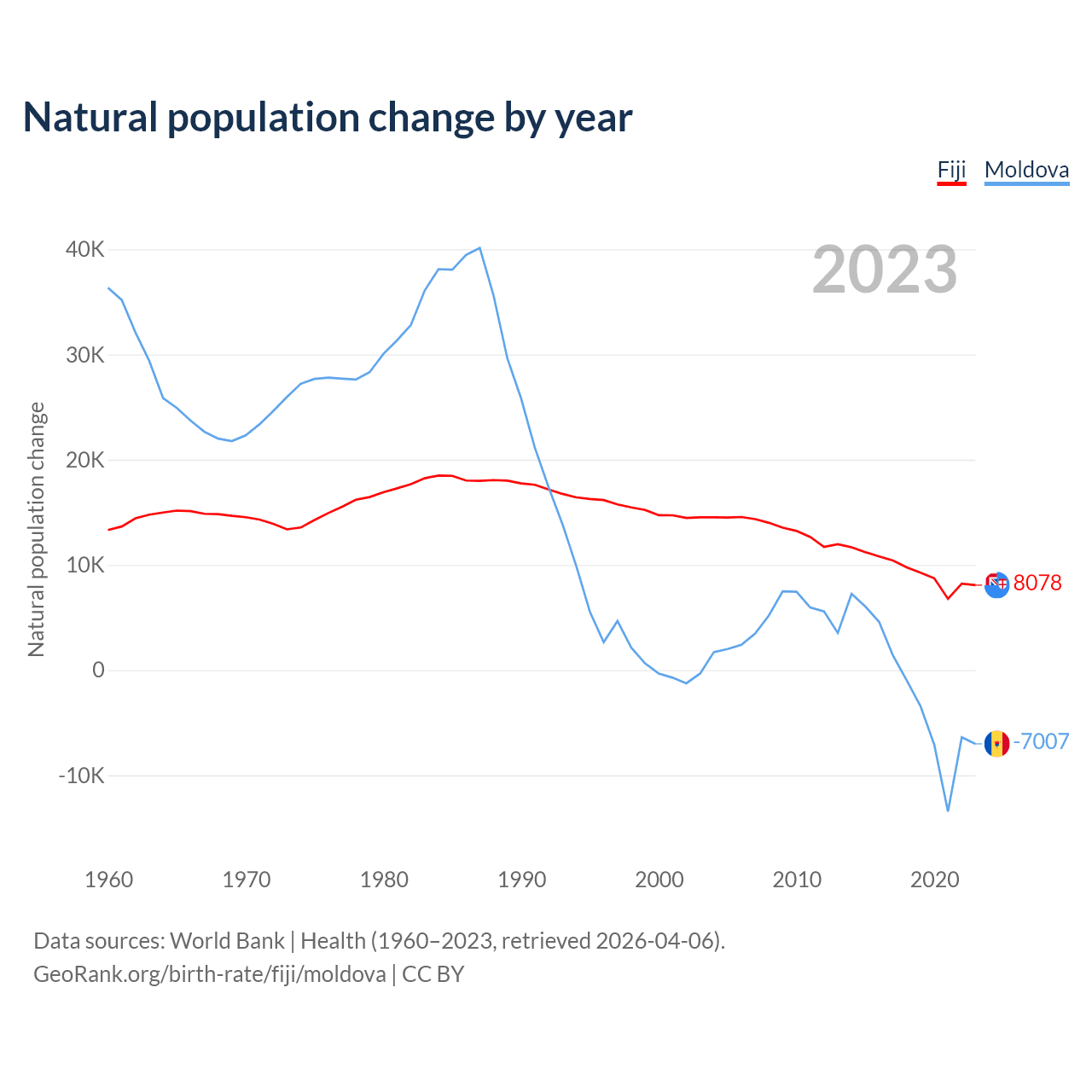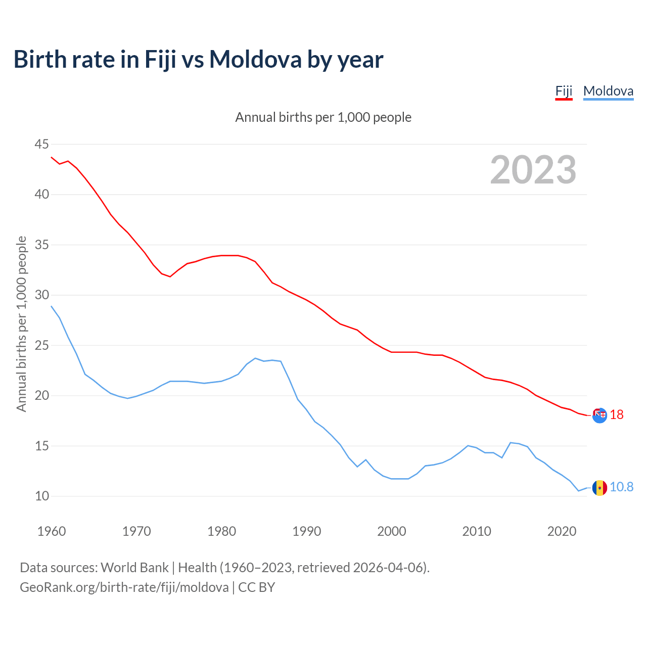 According to the latest available data on birth rates, the fertility rate in Fiji was 2.28 children per woman in 2023, compared to 1.73 in Moldova in 2023. The replacement level is considered to be 2.1 children per woman.
