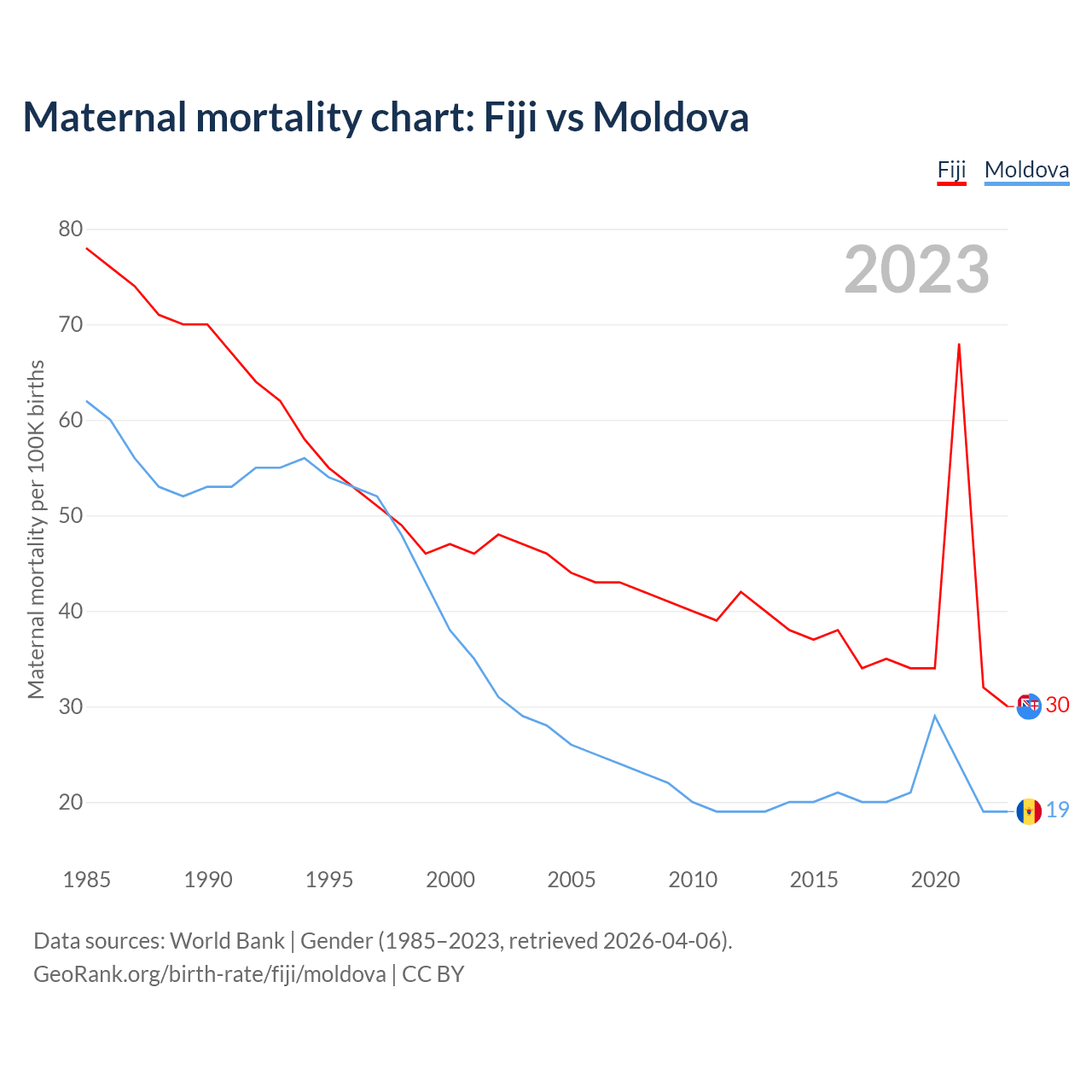 The maternal mortality rate, which is the probability of dying during childbirth or within 42 days of pregnancy termination, is 30 deaths per 100,000 live births in Fiji, compared to 19 deaths in Moldova.
