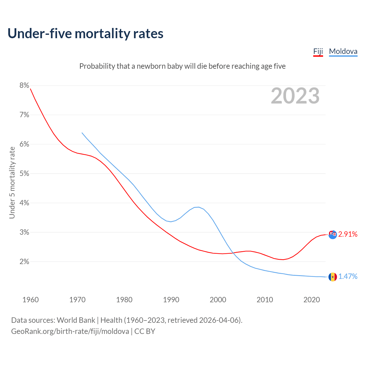 The chance that a newborn baby will die before reaching age five is 2.91% in Fiji and 1.47% in Moldova. Above is a chart with historical data on under-five mortality rates.