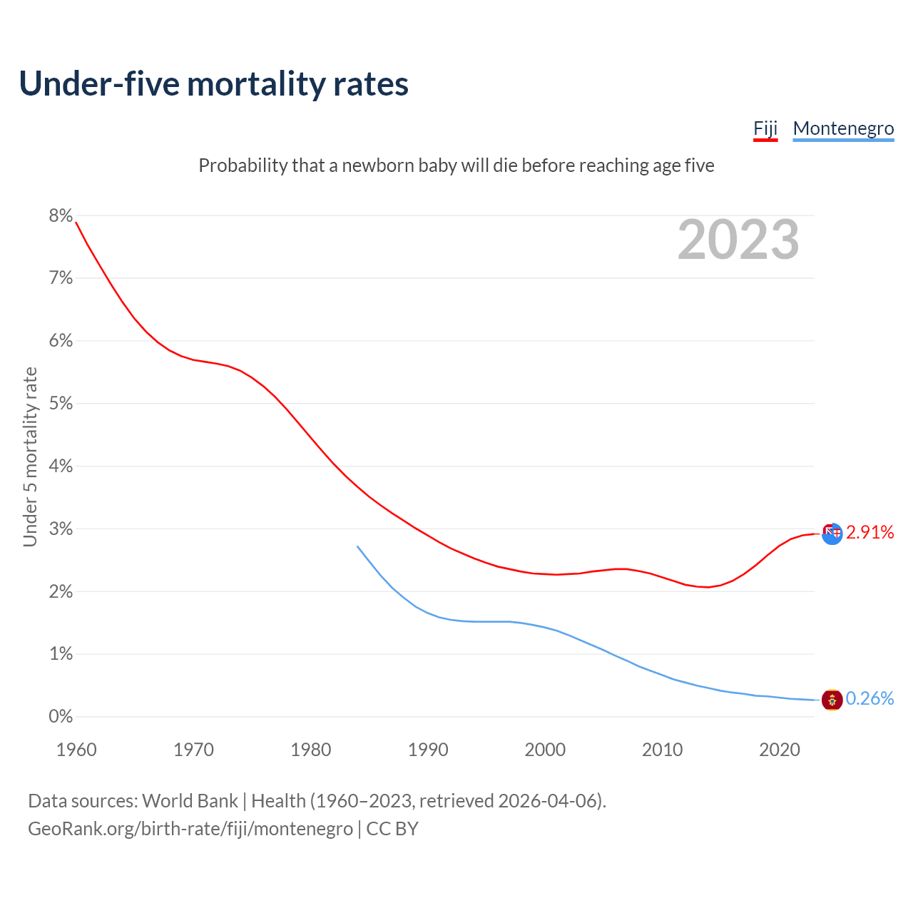 The chance that a newborn baby will die before reaching age five is 2.91% in Fiji and 0.26% in Montenegro. Above is a chart with historical data on under-five mortality rates.