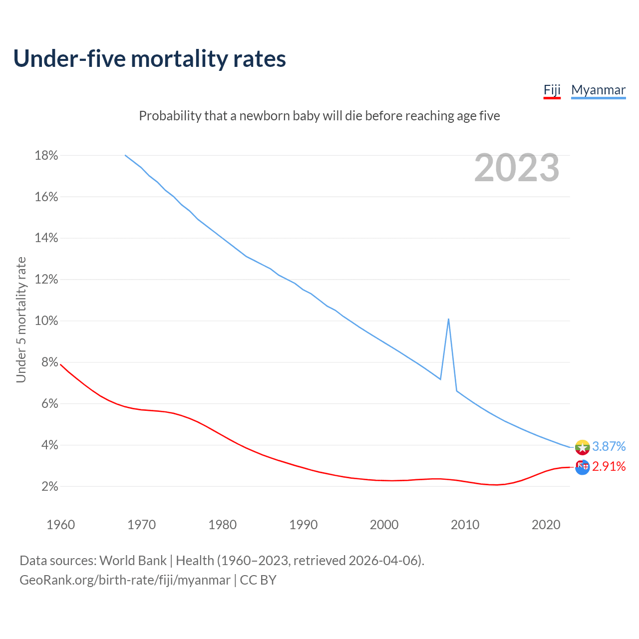 The chance that a newborn baby will die before reaching age five is 2.91% in Fiji and 3.87% in Myanmar. Above is a chart with historical data on under-five mortality rates.