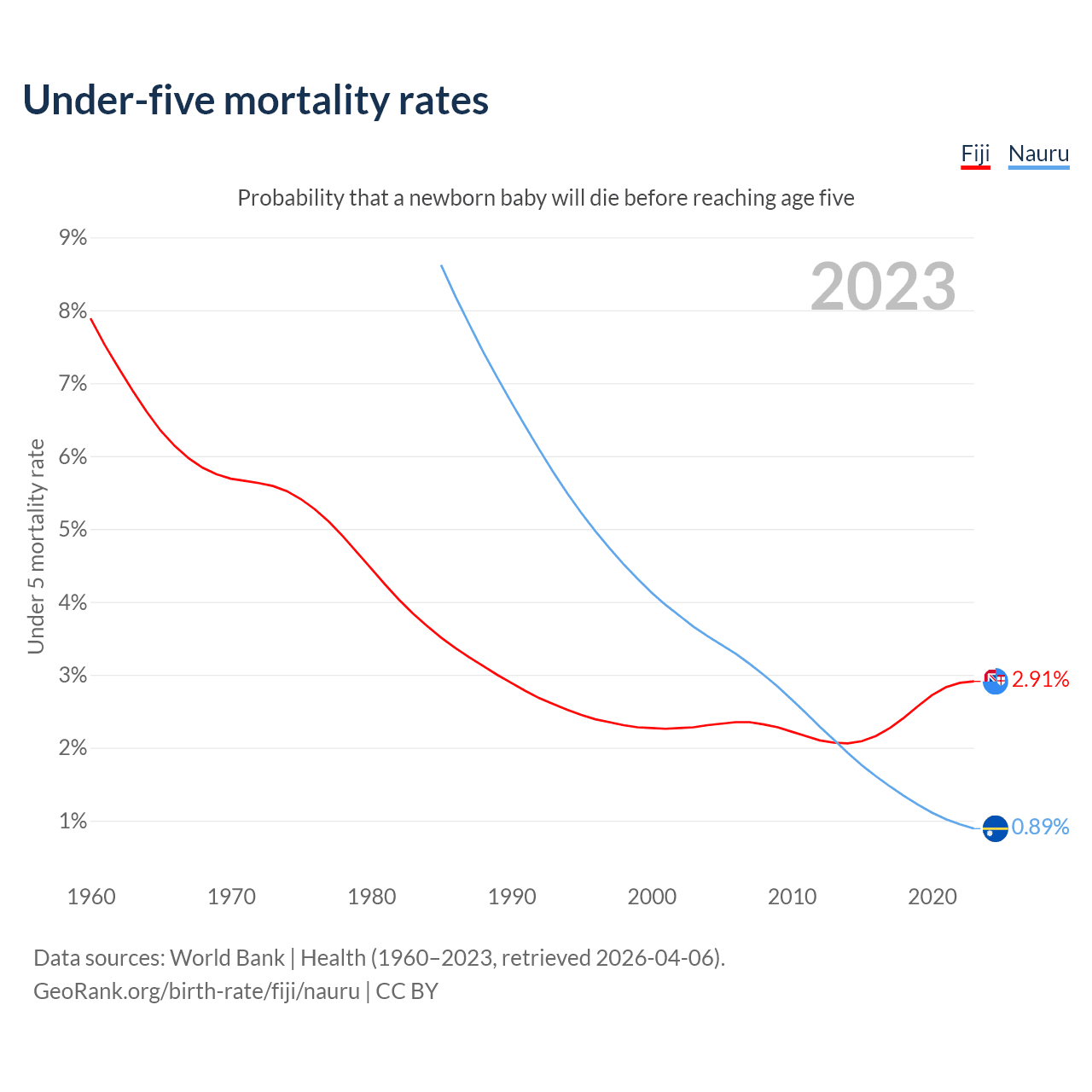 The chance that a newborn baby will die before reaching age five is 2.91% in Fiji and 0.89% in Nauru. Above is a chart with historical data on under-five mortality rates.