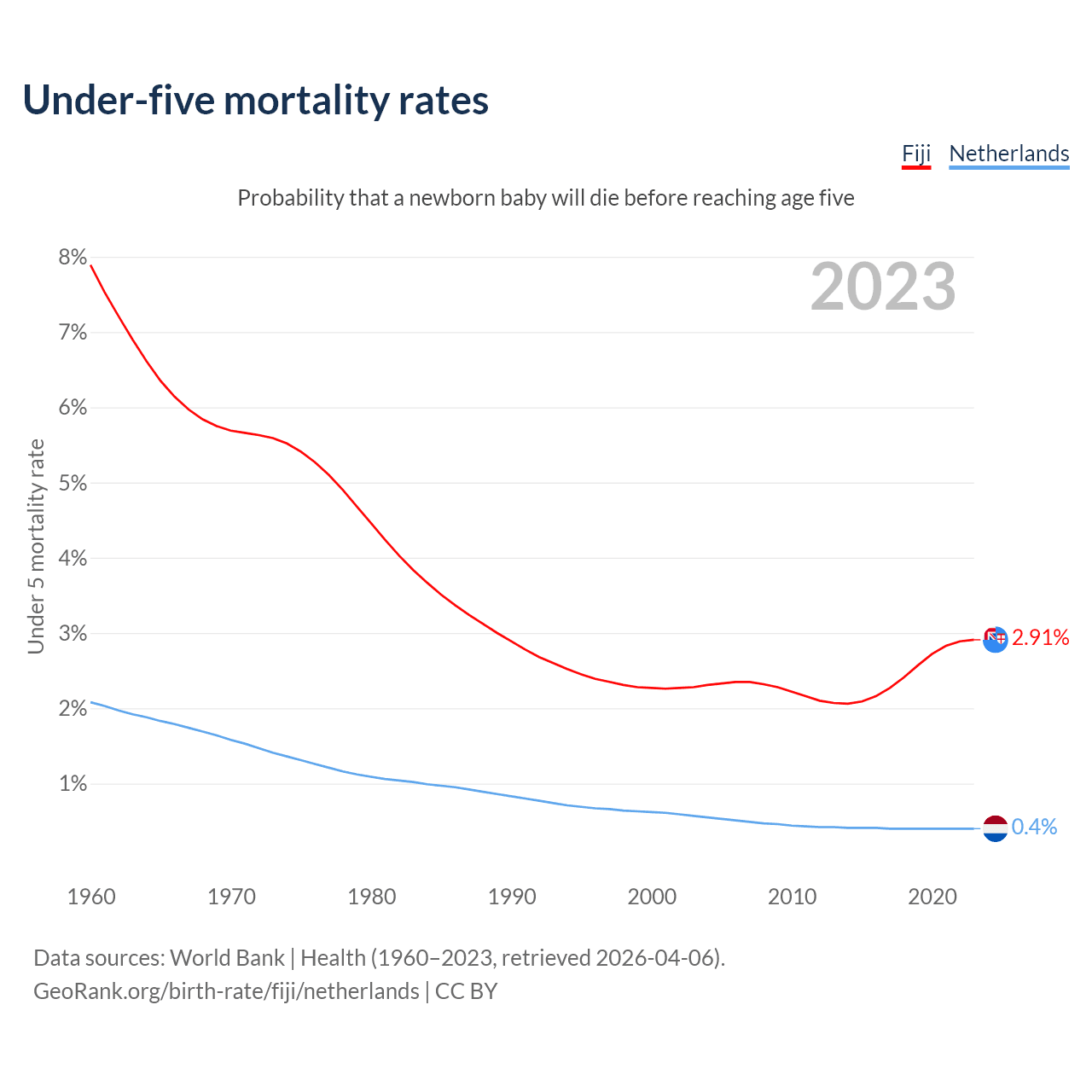 The chance that a newborn baby will die before reaching age five is 2.91% in Fiji and 0.4% in the Netherlands. Above is a chart with historical data on under-five mortality rates.