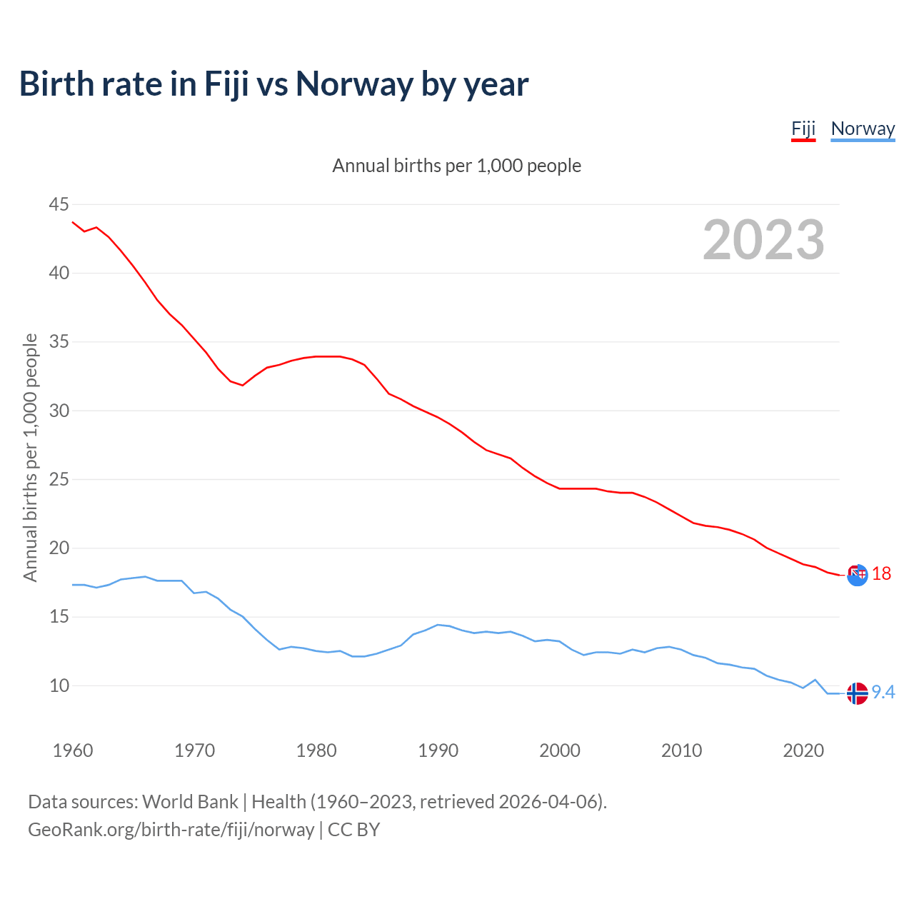 Fiji has an annual birth rate of 18 births per 1,000 people, compared to 9.4 for Norway. The average number of children a woman is expected to have during her lifetime — the fertility rate, is 2.28 in Fiji and 1.4 in Norway — 38.6% difference.