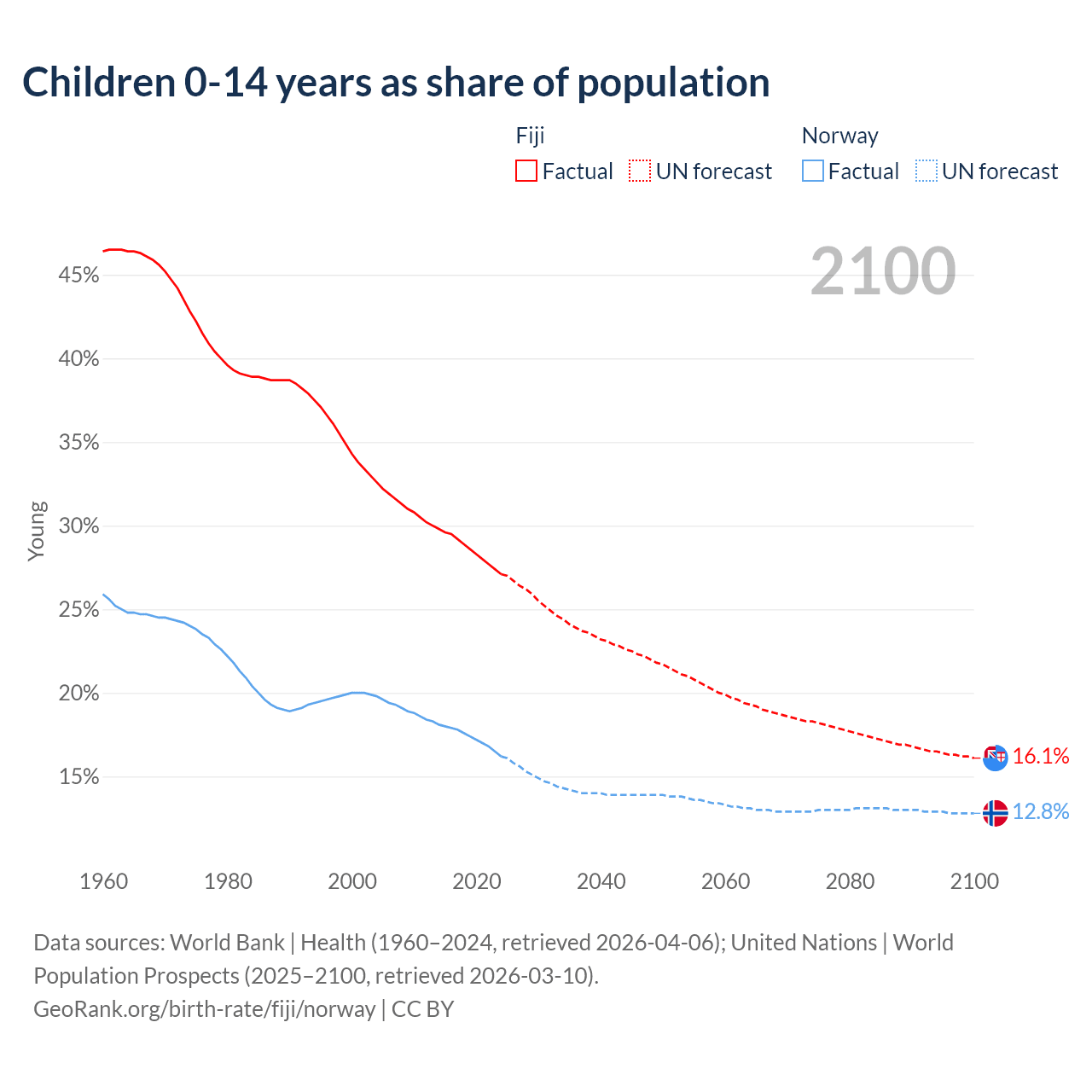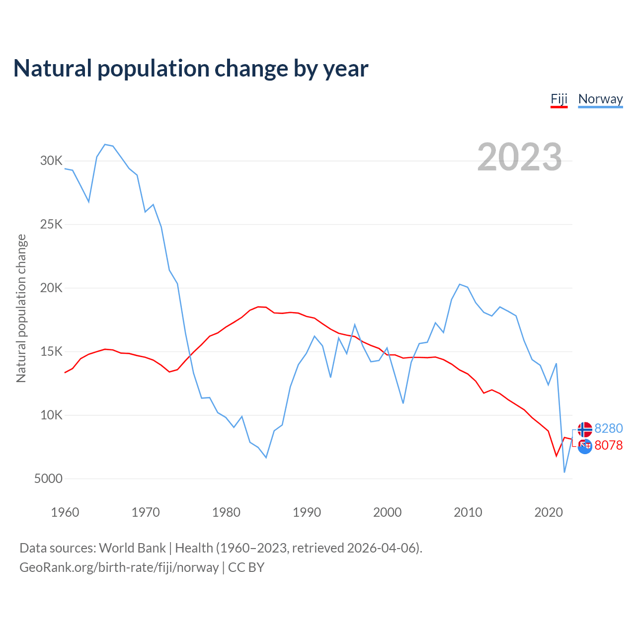 According to the latest available data on birth rates, the fertility rate in Fiji was 2.28 children per woman in 2023, compared to 1.4 in Norway in 2023. The replacement level is considered to be 2.1 children per woman.