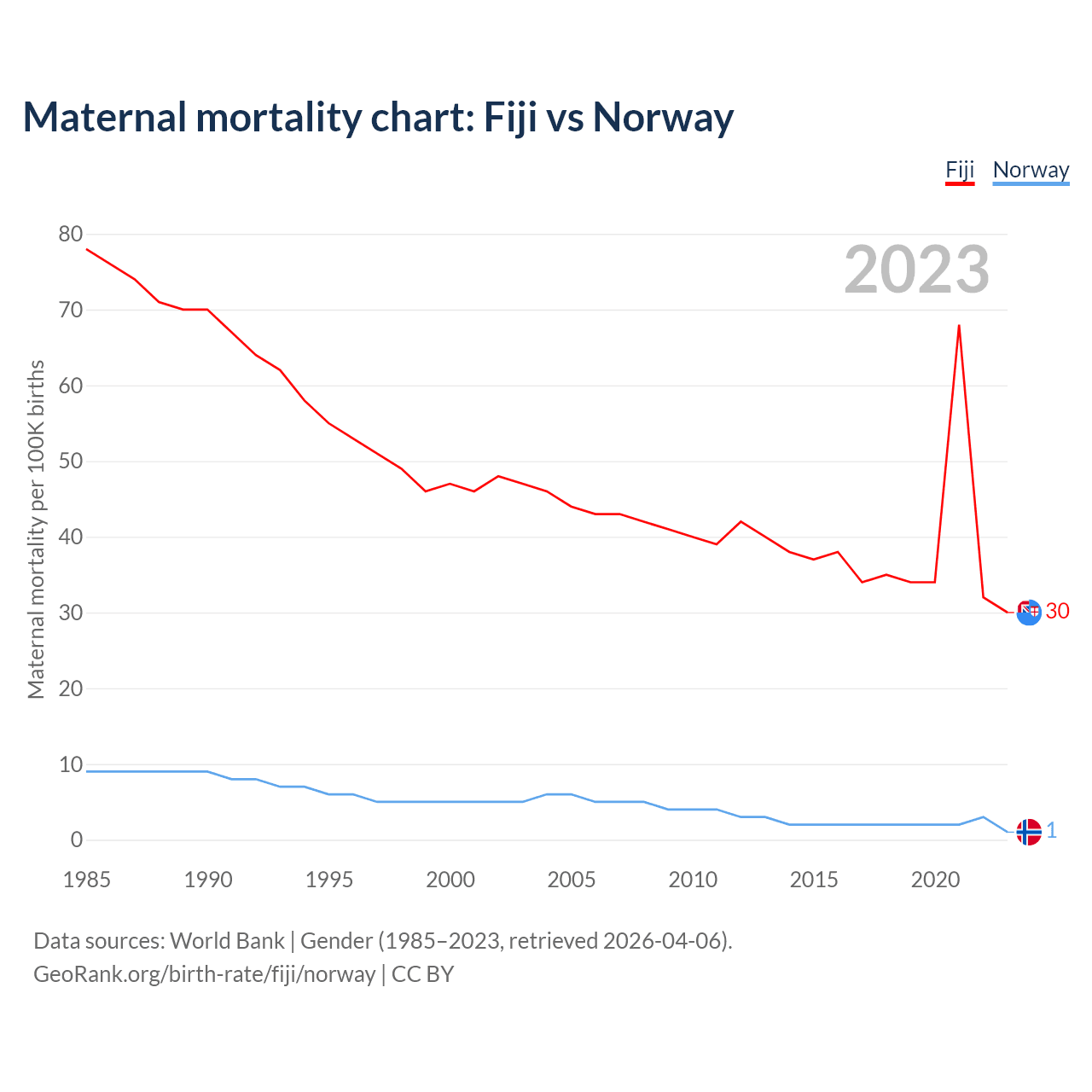 The maternal mortality rate, which is the probability of dying during childbirth or within 42 days of pregnancy termination, is 30 deaths per 100,000 live births in Fiji, compared to 1 deaths in Norway.