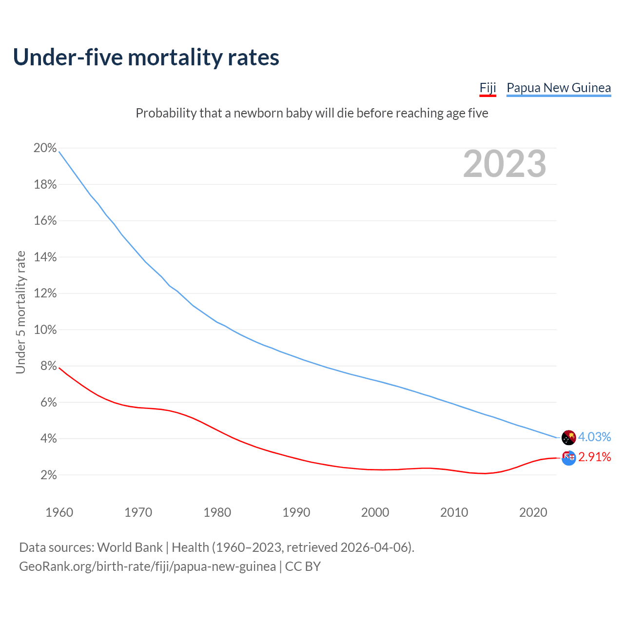 The chance that a newborn baby will die before reaching age five is 2.91% in Fiji and 4.03% in Papua New Guinea. Above is a chart with historical data on under-five mortality rates.