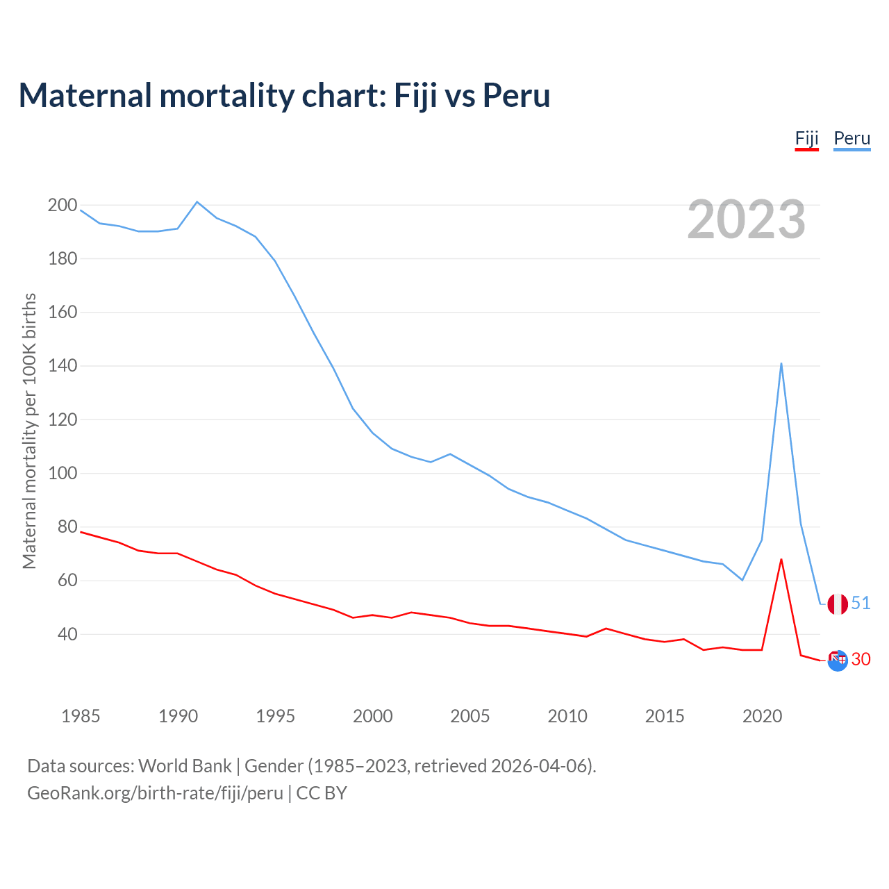 The maternal mortality rate, which is the probability of dying during childbirth or within 42 days of pregnancy termination, is 30 deaths per 100,000 live births in Fiji, compared to 51 deaths in Peru.