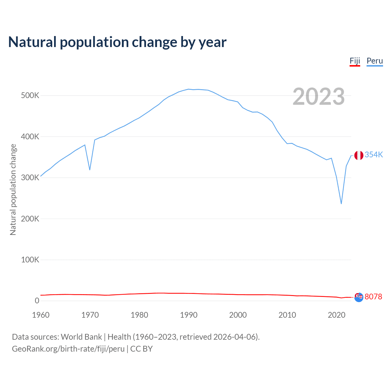 According to the latest available data on birth rates, the fertility rate in Fiji was 2.28 children per woman in 2023, compared to 1.98 in Peru in 2023. The replacement level is considered to be 2.1 children per woman.