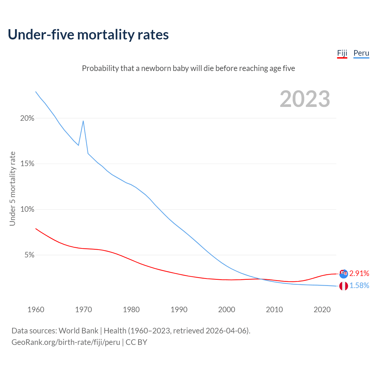 The chance that a newborn baby will die before reaching age five is 2.91% in Fiji and 1.58% in Peru. Above is a chart with historical data on under-five mortality rates.