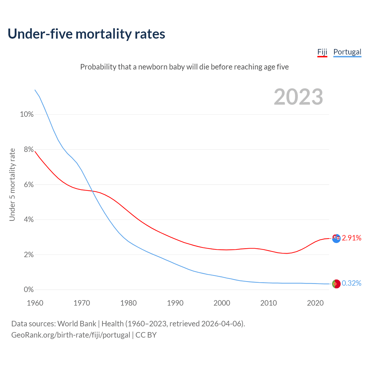 The chance that a newborn baby will die before reaching age five is 2.91% in Fiji and 0.32% in Portugal. Above is a chart with historical data on under-five mortality rates.
