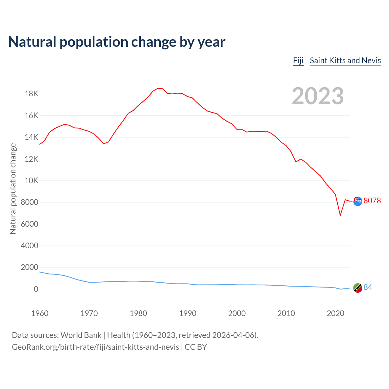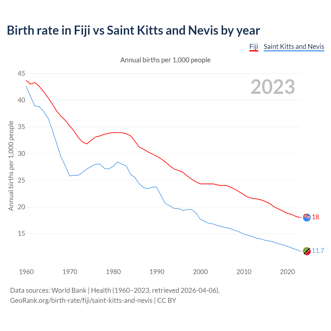 Fiji has an annual birth rate of 18 births per 1,000 people, compared to 11.7 for Saint Kitts and Nevis. The average number of children a woman is expected to have during her lifetime — the fertility rate, is 2.28 in Fiji and 1.51 in Saint Kitts and Nevis — 34% difference.