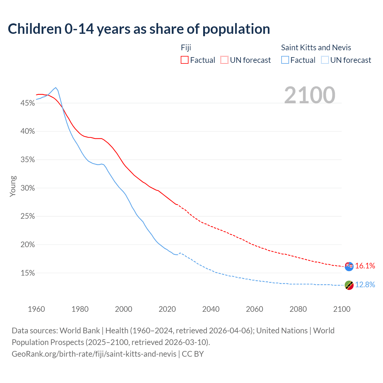 According to the latest available data on birth rates, the fertility rate in Fiji was 2.28 children per woman in 2023, compared to 1.51 in Saint Kitts and Nevis in 2023. The replacement level is considered to be 2.1 children per woman.