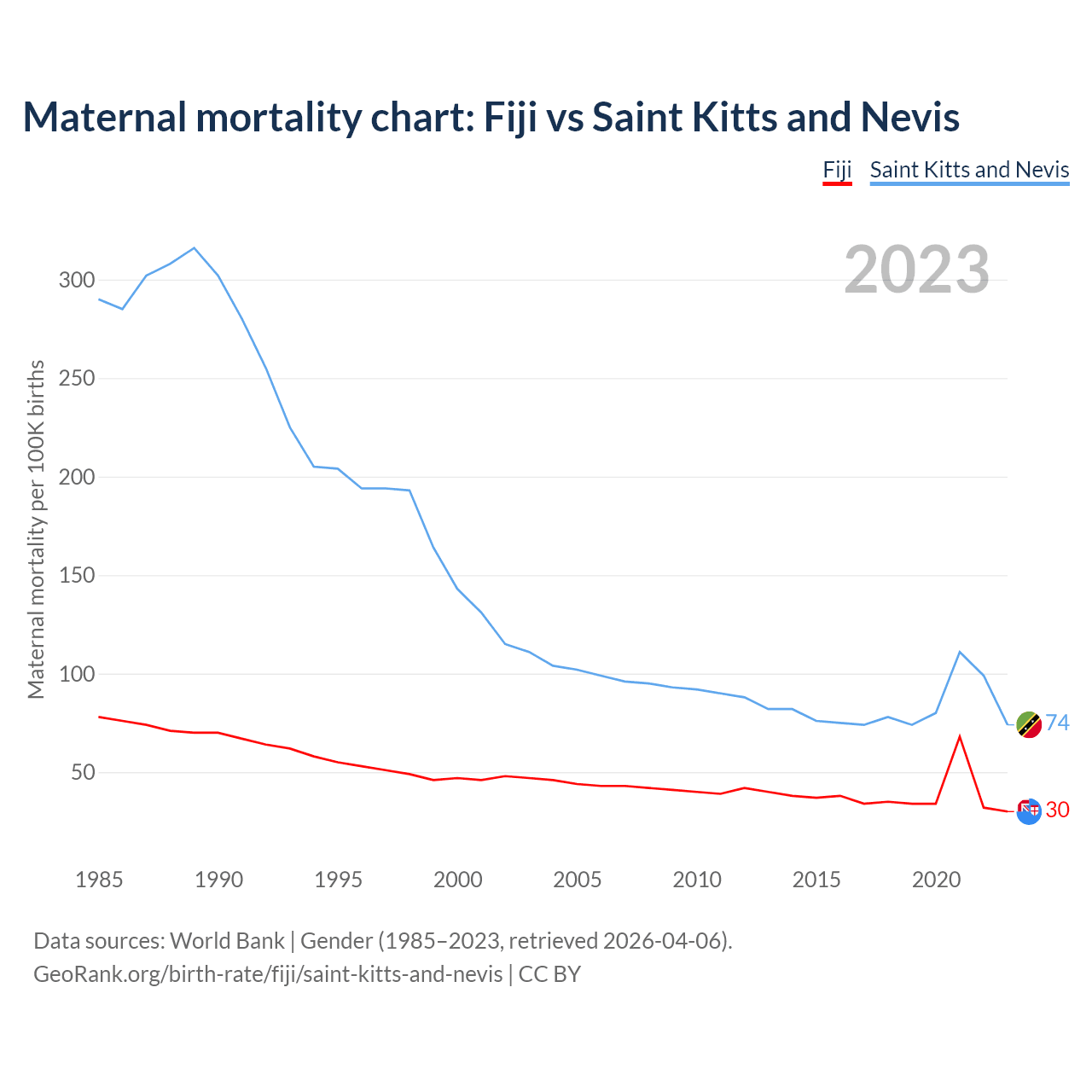 The maternal mortality rate, which is the probability of dying during childbirth or within 42 days of pregnancy termination, is 30 deaths per 100,000 live births in Fiji, compared to 74 deaths in Saint Kitts and Nevis.