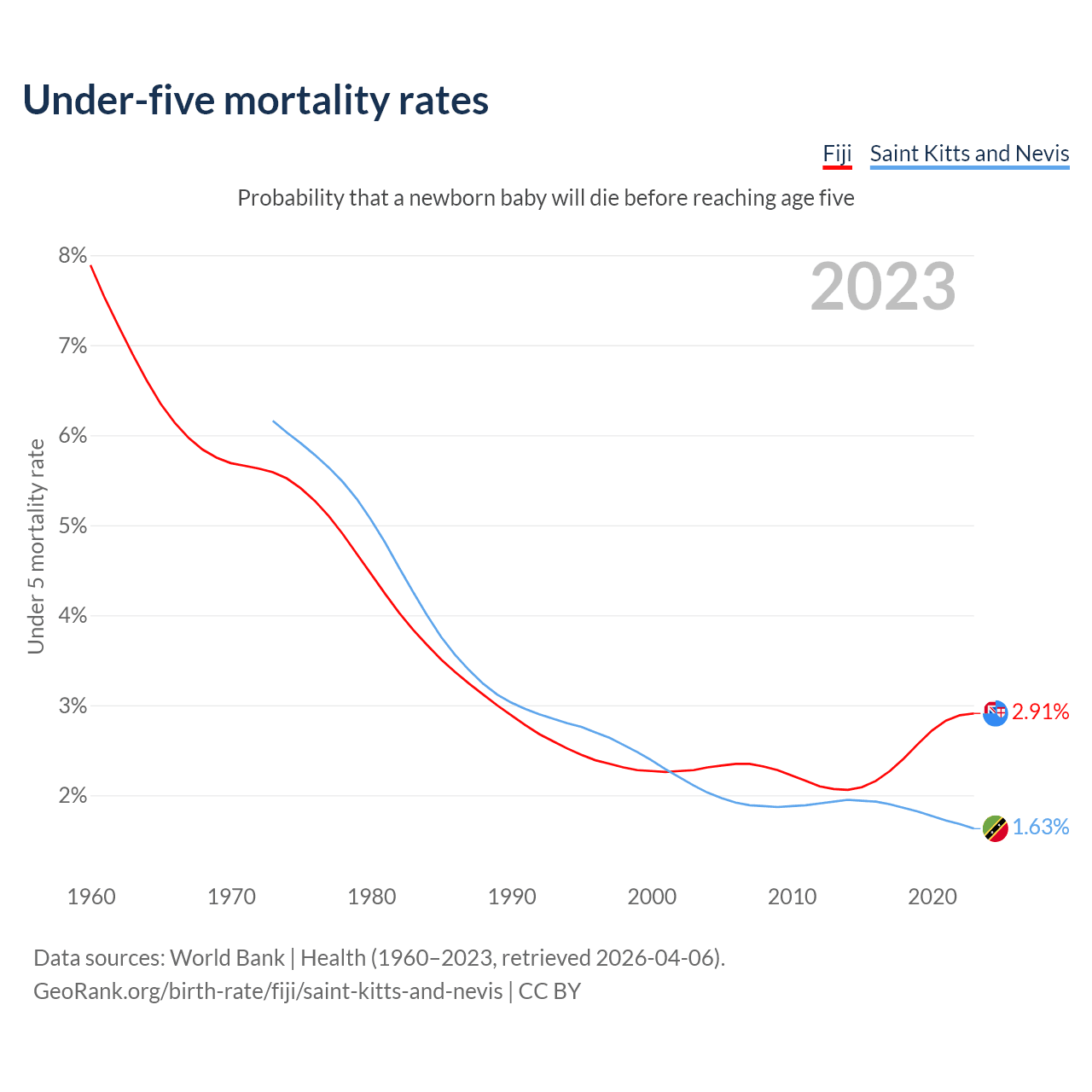 The chance that a newborn baby will die before reaching age five is 2.91% in Fiji and 1.63% in Saint Kitts and Nevis. Above is a chart with historical data on under-five mortality rates.