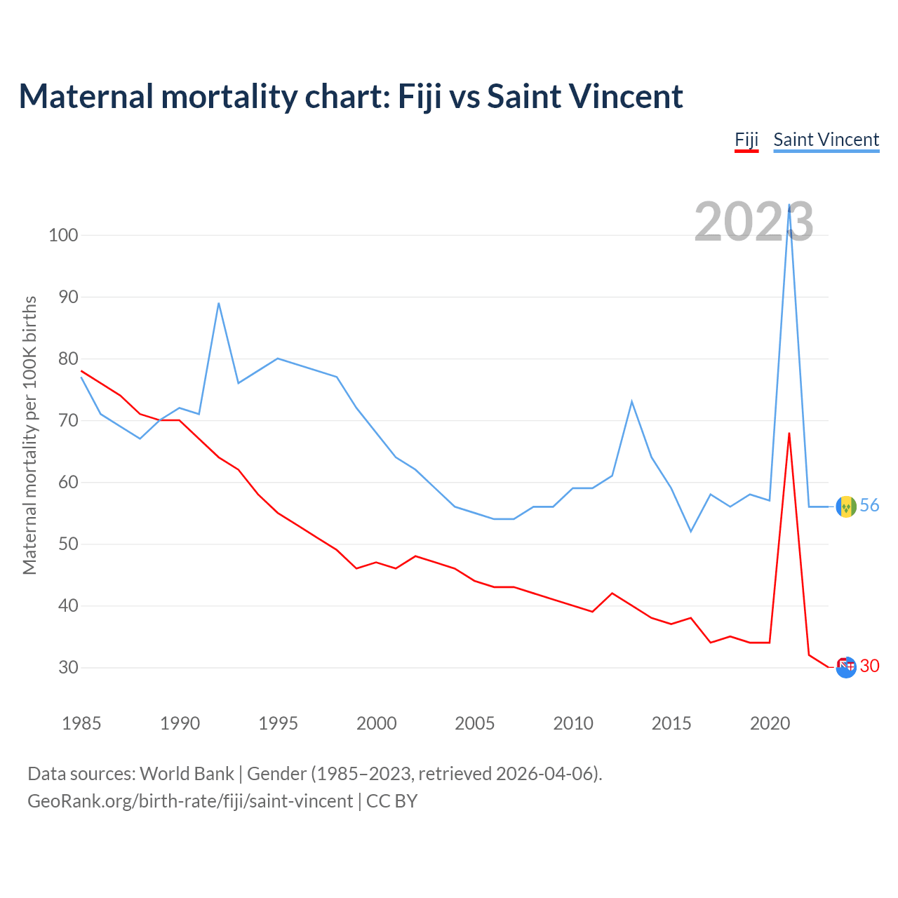 The maternal mortality rate, which is the probability of dying during childbirth or within 42 days of pregnancy termination, is 30 deaths per 100,000 live births in Fiji, compared to 56 deaths in Saint Vincent.