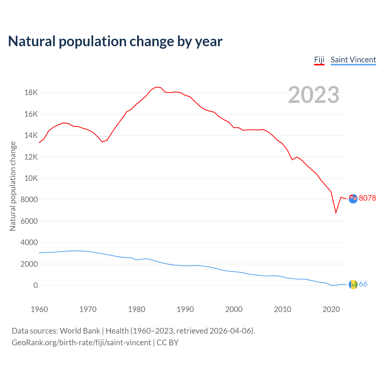 Fiji has an annual birth rate of 18 births per 1,000 people, compared to 12.2 for Saint Vincent. The average number of children a woman is expected to have during her lifetime — the fertility rate, is 2.28 in Fiji and 1.78 in Saint Vincent — 22.2% difference.