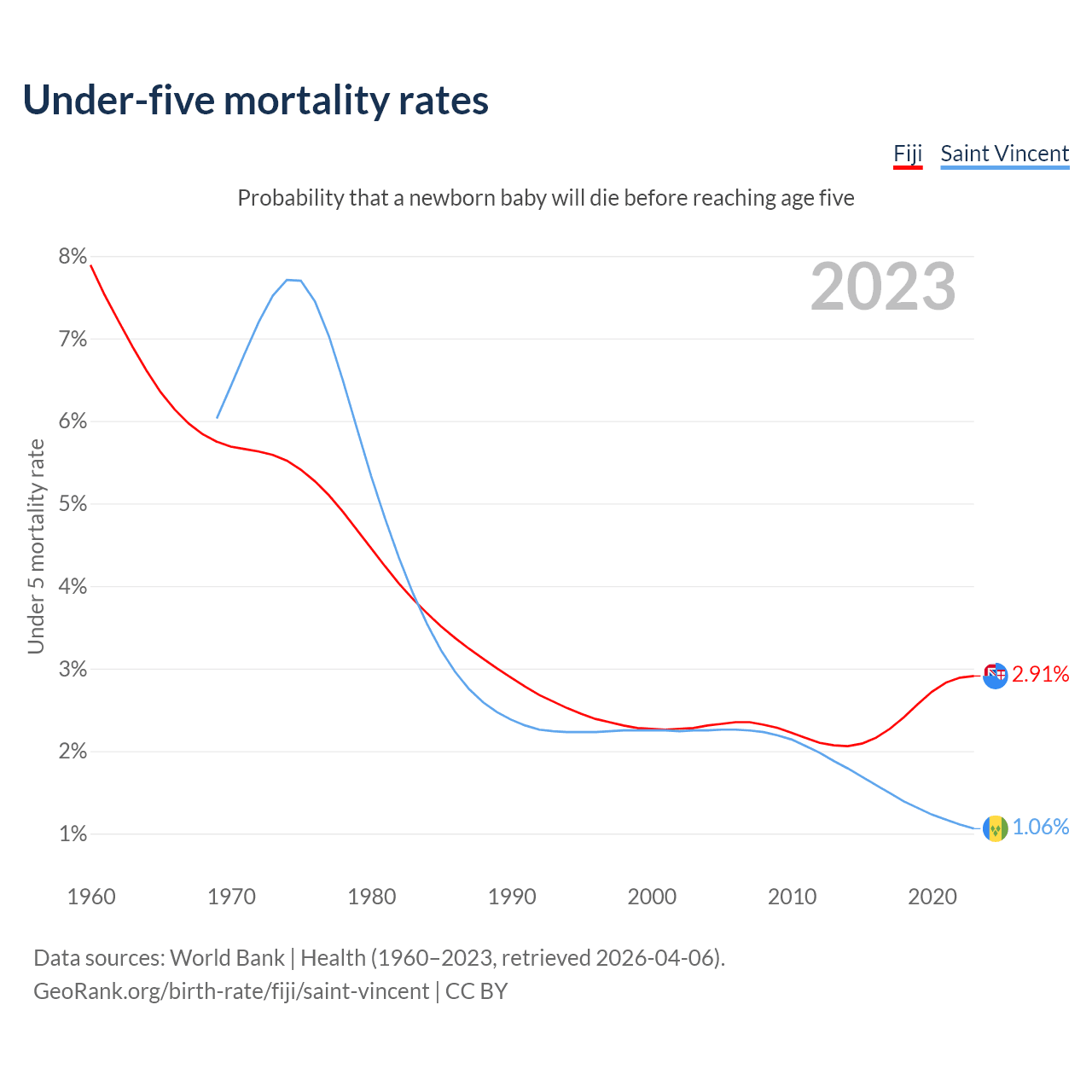 The chance that a newborn baby will die before reaching age five is 2.91% in Fiji and 1.06% in Saint Vincent. Above is a chart with historical data on under-five mortality rates.