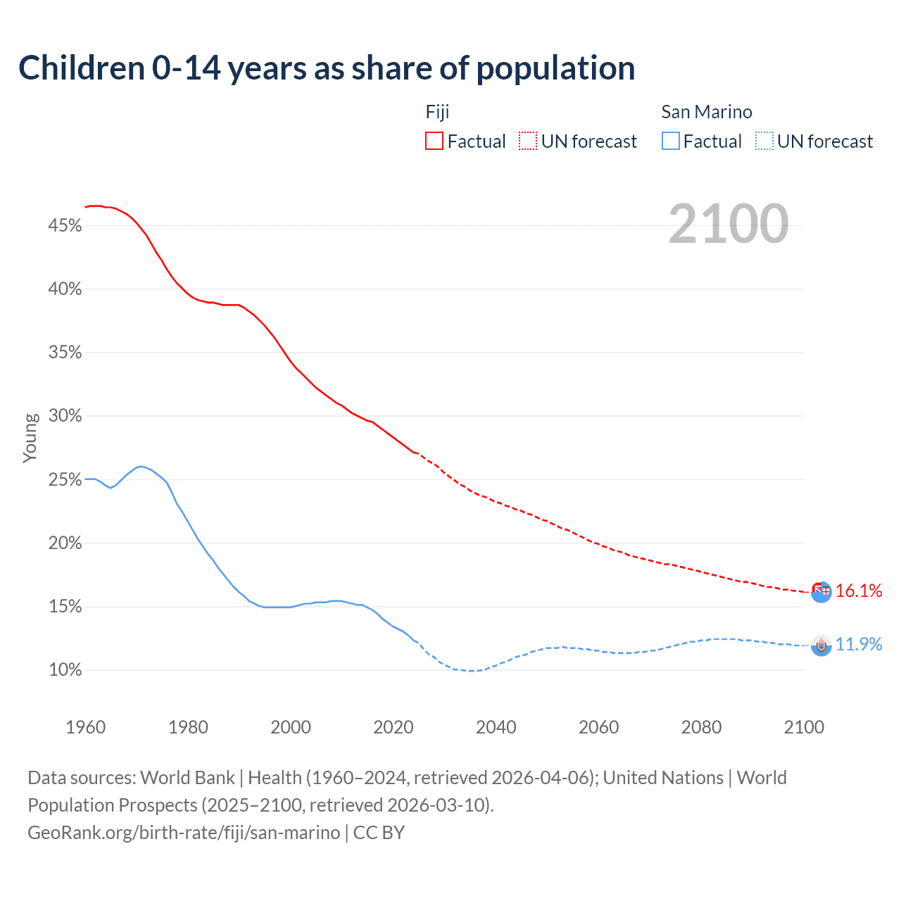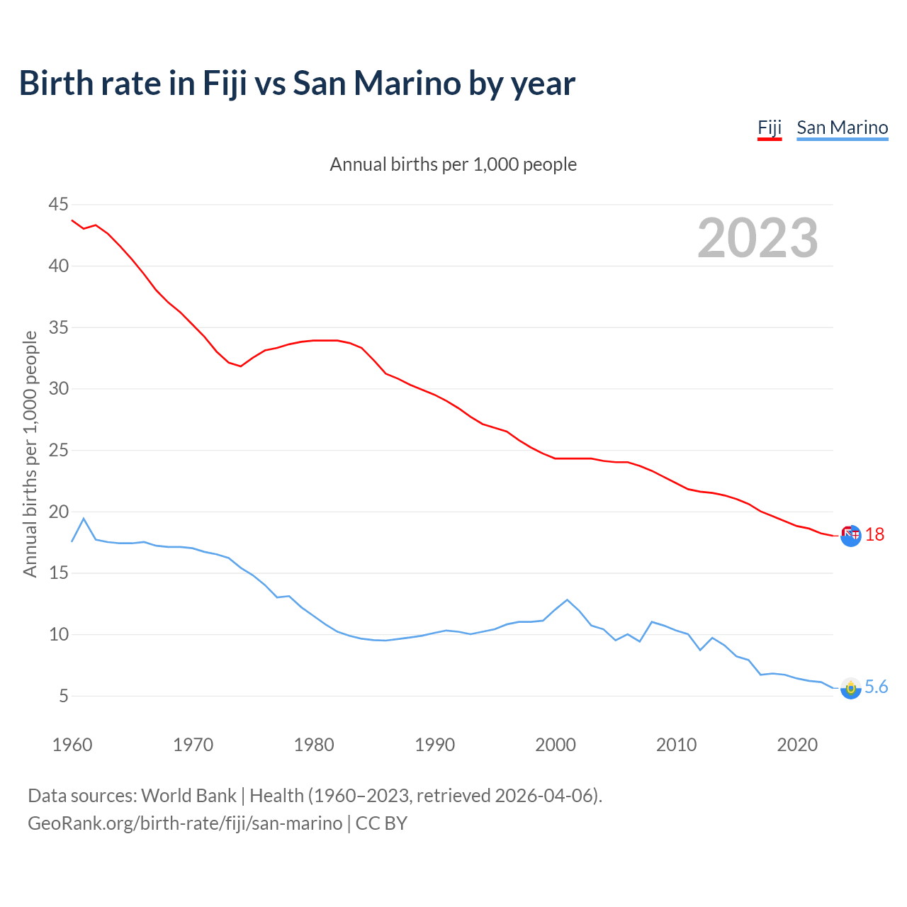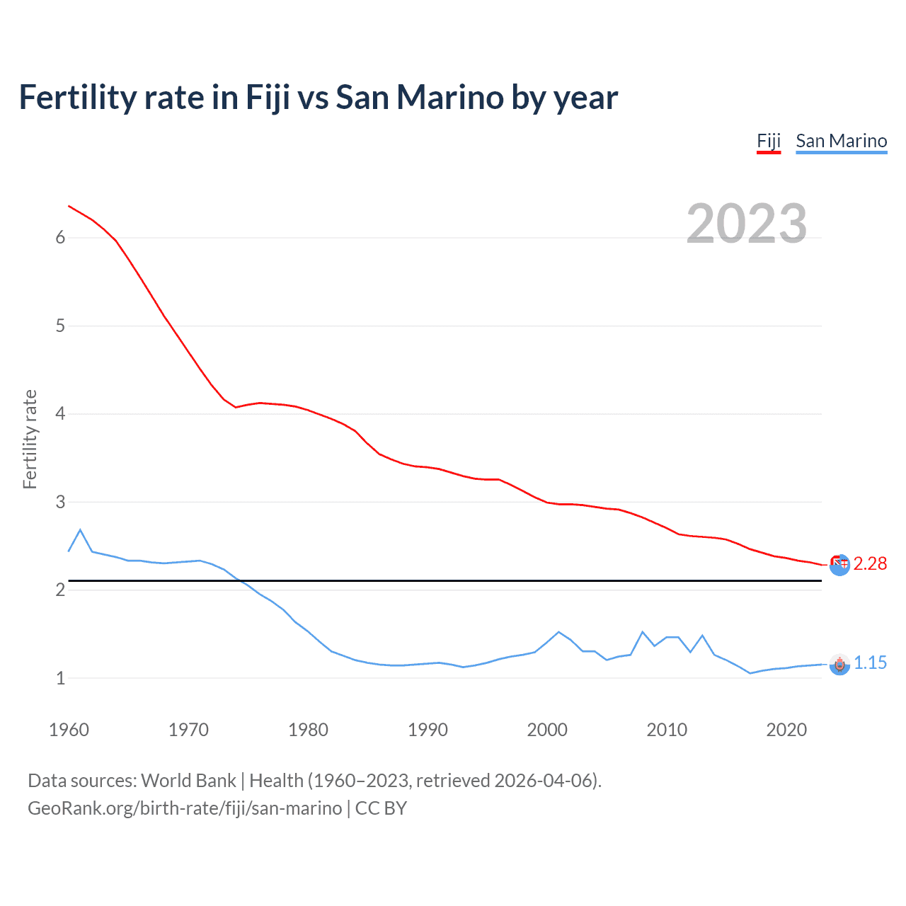 According to the latest available data on birth rates, the fertility rate in Fiji was 2.28 children per woman in 2023, compared to 1.15 in San Marino in 2023. The replacement level is considered to be 2.1 children per woman.