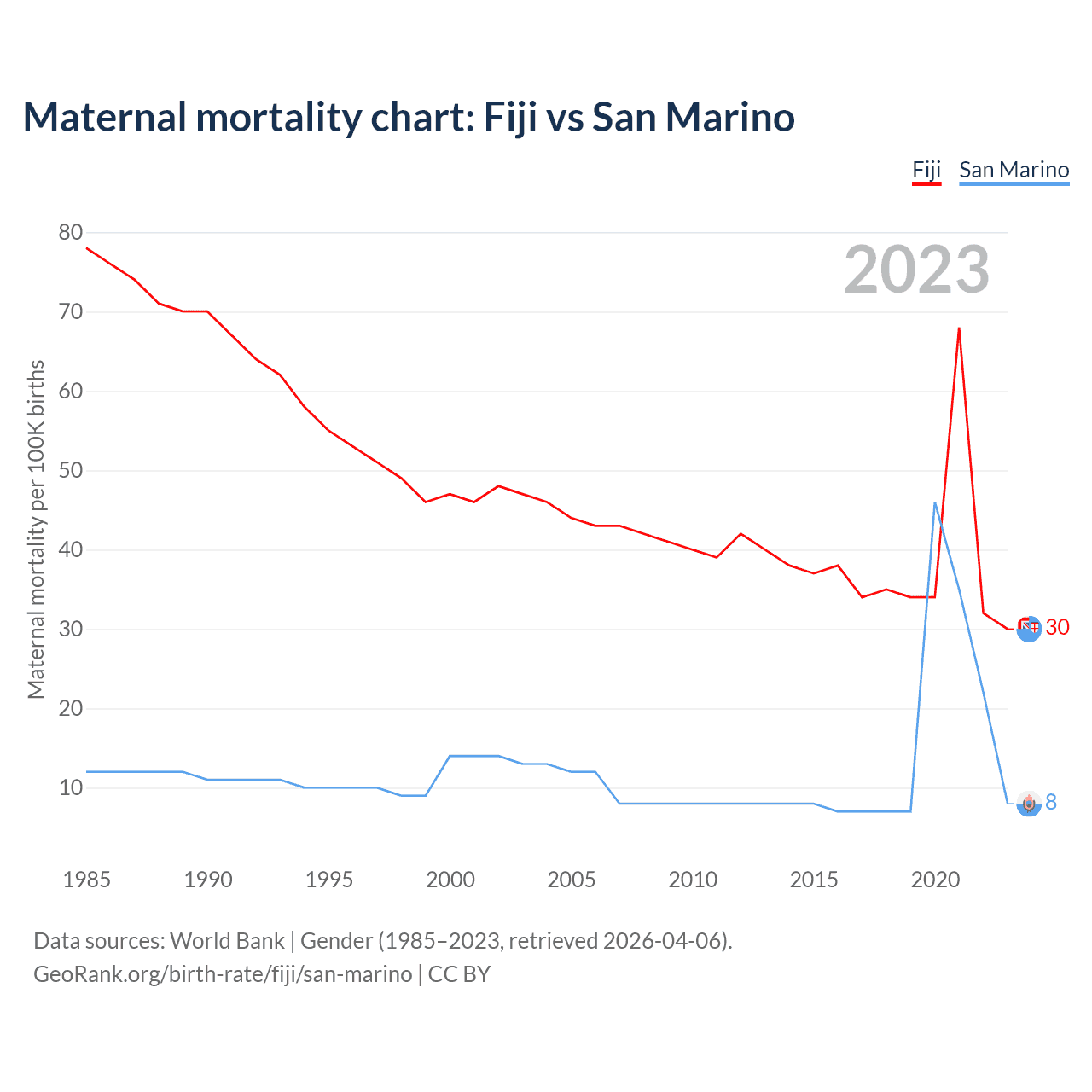 The maternal mortality rate, which is the probability of dying during childbirth or within 42 days of pregnancy termination, is 30 deaths per 100,000 live births in Fiji, compared to 8 deaths in San Marino.