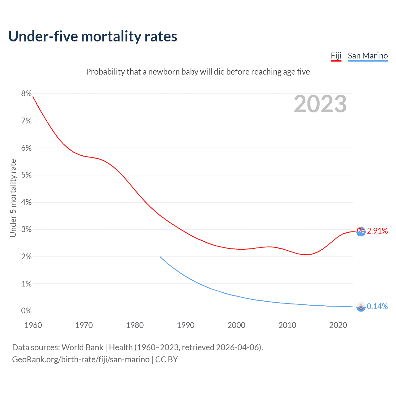 The chance that a newborn baby will die before reaching age five is 2.91% in Fiji and 0.14% in San Marino. Above is a chart with historical data on under-five mortality rates.