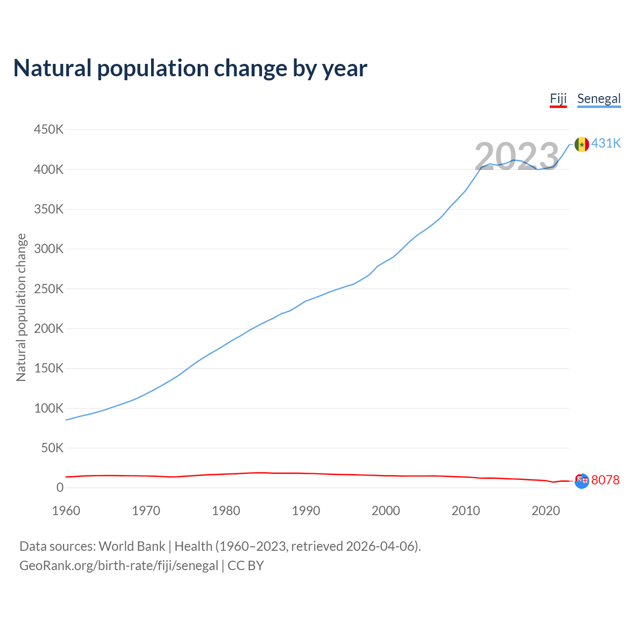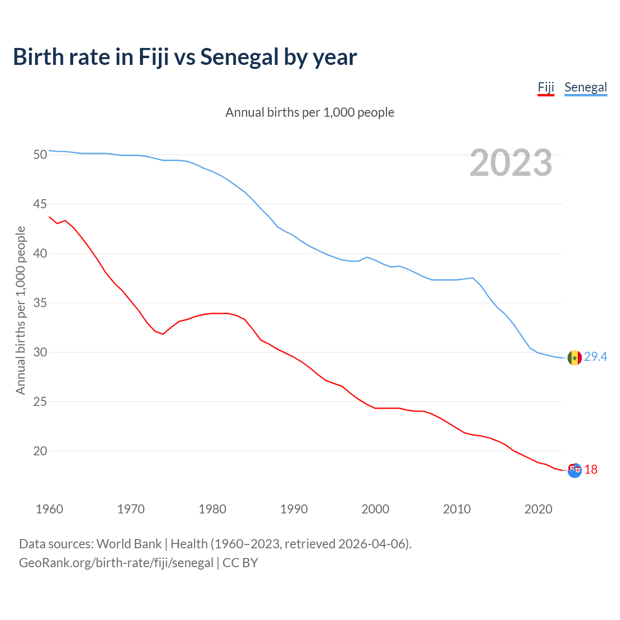 Fiji has an annual birth rate of 18 births per 1,000 people, compared to 29.4 for Senegal. The average number of children a woman is expected to have during her lifetime — the fertility rate, is 2.28 in Fiji and 3.82 in Senegal — 67.4% difference.