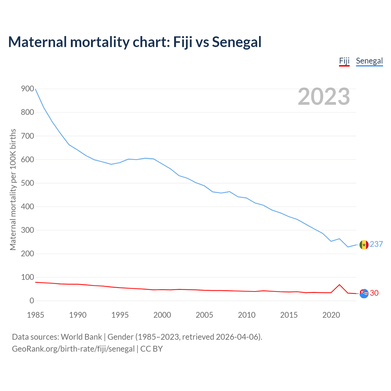 The maternal mortality rate, which is the probability of dying during childbirth or within 42 days of pregnancy termination, is 30 deaths per 100,000 live births in Fiji, compared to 237 deaths in Senegal.