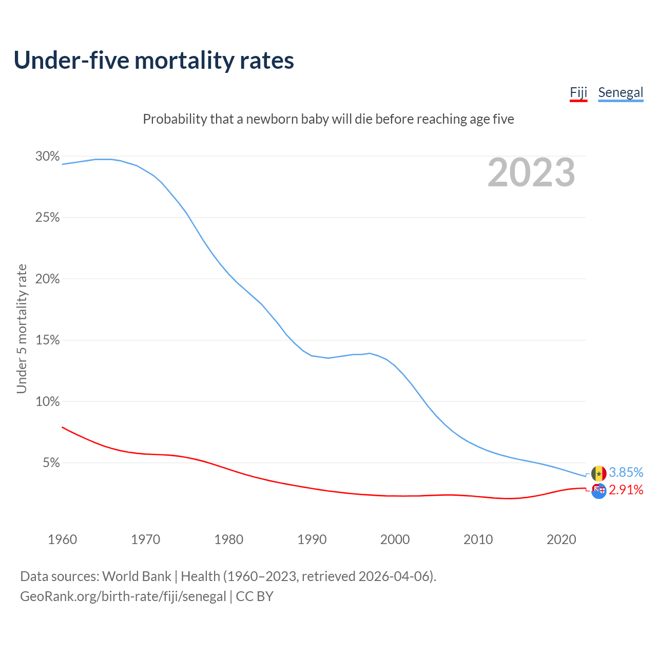 The chance that a newborn baby will die before reaching age five is 2.91% in Fiji and 3.85% in Senegal. Above is a chart with historical data on under-five mortality rates.