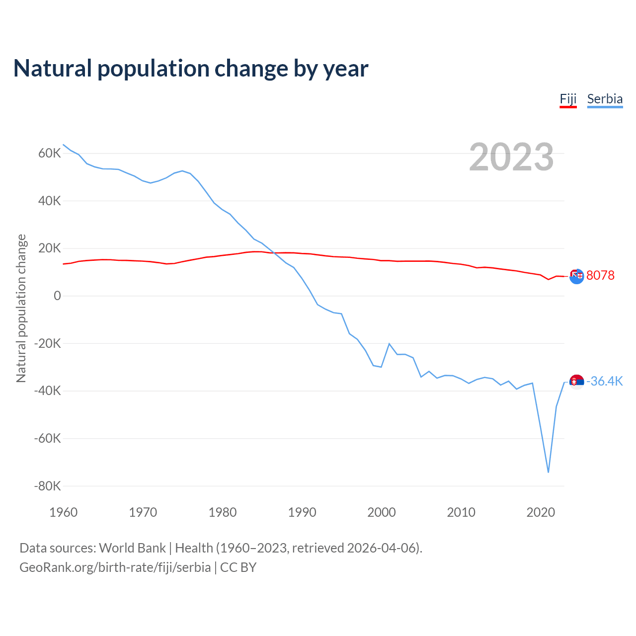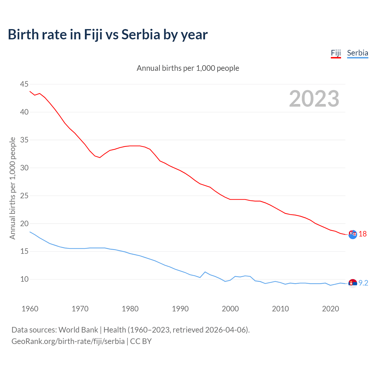According to the latest available data on birth rates, the fertility rate in Fiji was 2.28 children per woman in 2023, compared to 1.61 in Serbia in 2023. The replacement level is considered to be 2.1 children per woman.