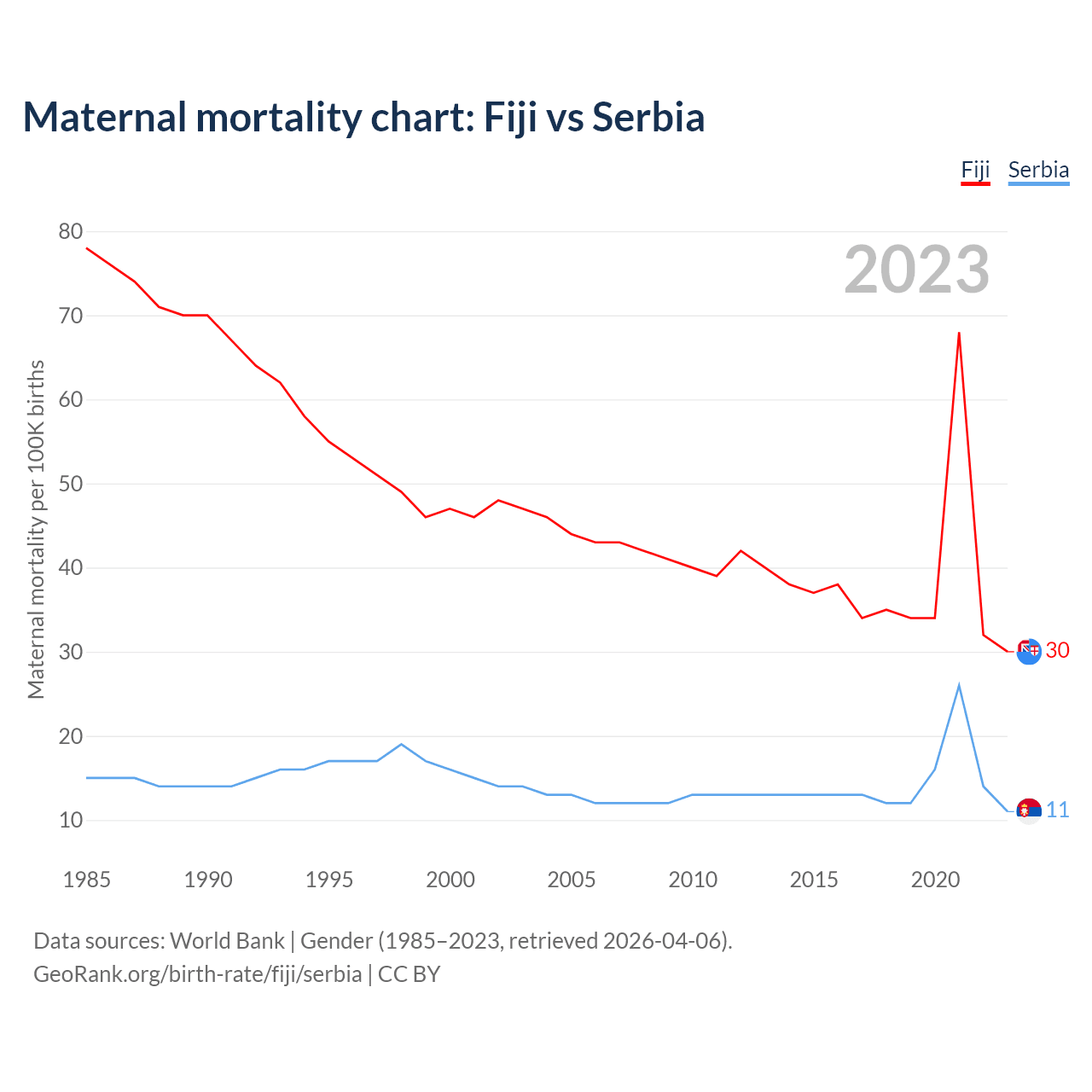 The maternal mortality rate, which is the probability of dying during childbirth or within 42 days of pregnancy termination, is 30 deaths per 100,000 live births in Fiji, compared to 11 deaths in Serbia.