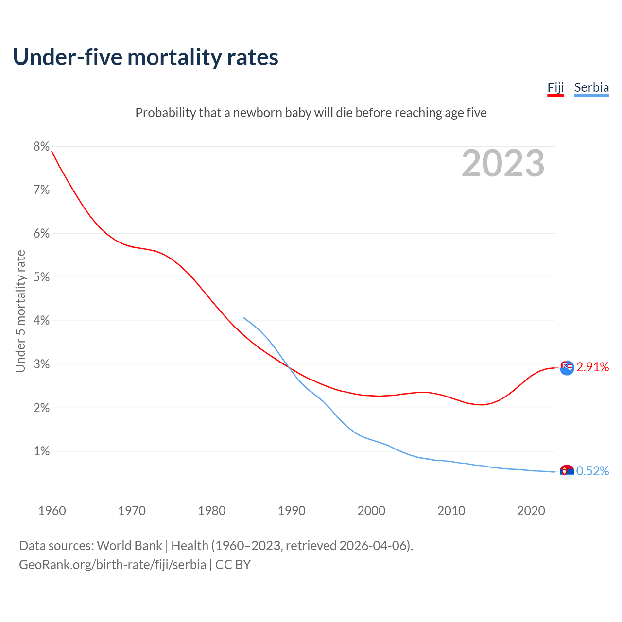 The chance that a newborn baby will die before reaching age five is 2.91% in Fiji and 0.52% in Serbia. Above is a chart with historical data on under-five mortality rates.