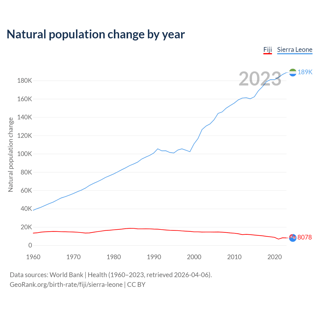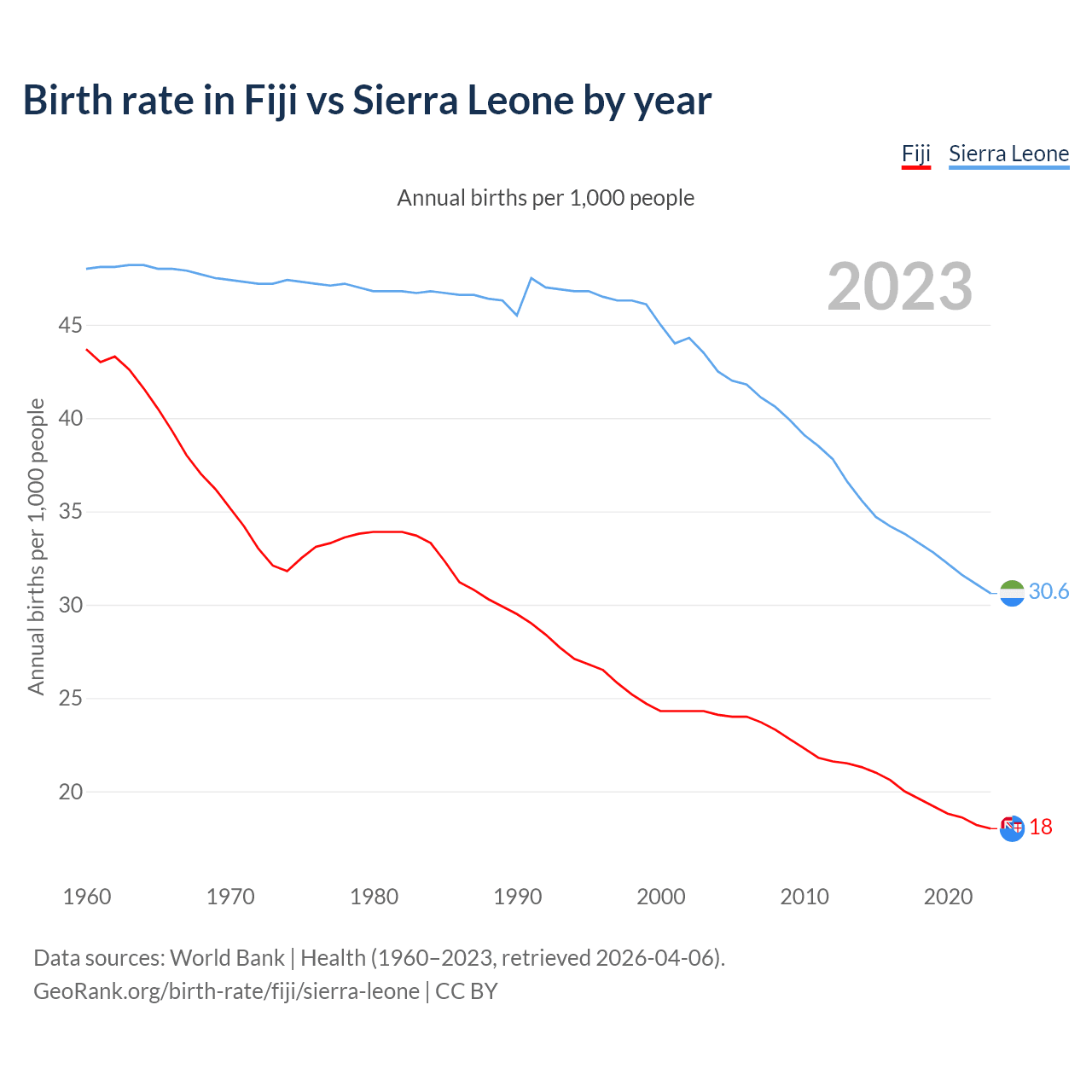 Fiji has an annual birth rate of 18 births per 1,000 people, compared to 30.6 for Sierra Leone. The average number of children a woman is expected to have during her lifetime — the fertility rate, is 2.28 in Fiji and 3.79 in Sierra Leone — 66.2% difference.