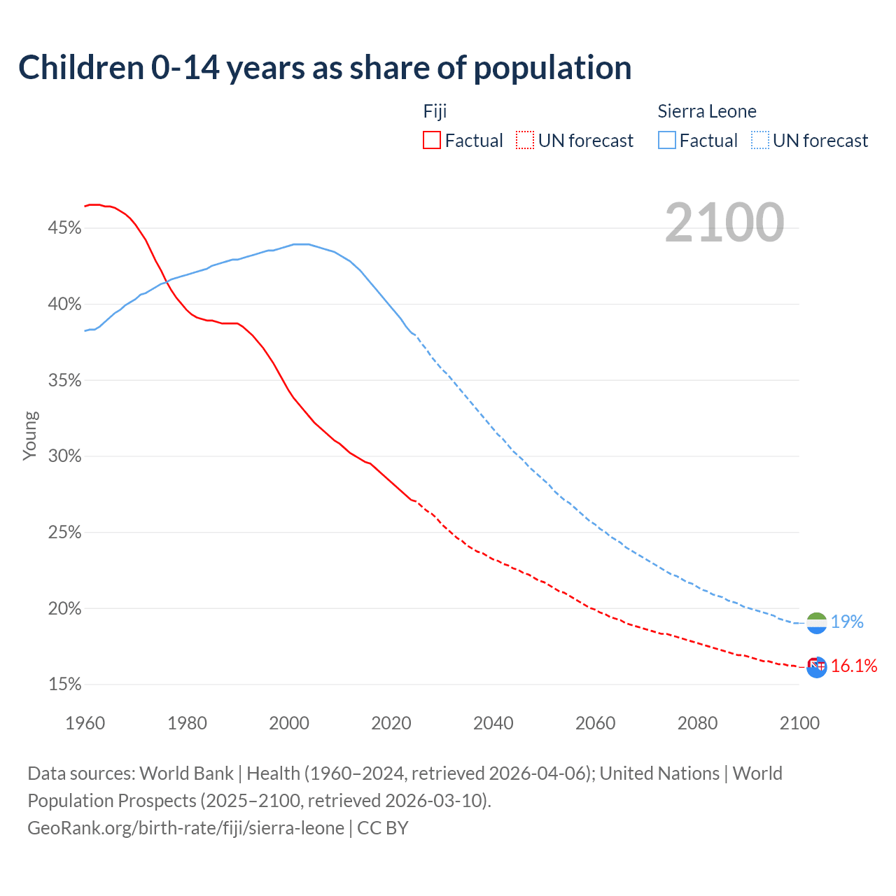 According to the latest available data on birth rates, the fertility rate in Fiji was 2.28 children per woman in 2023, compared to 3.79 in Sierra Leone in 2023. The replacement level is considered to be 2.1 children per woman.