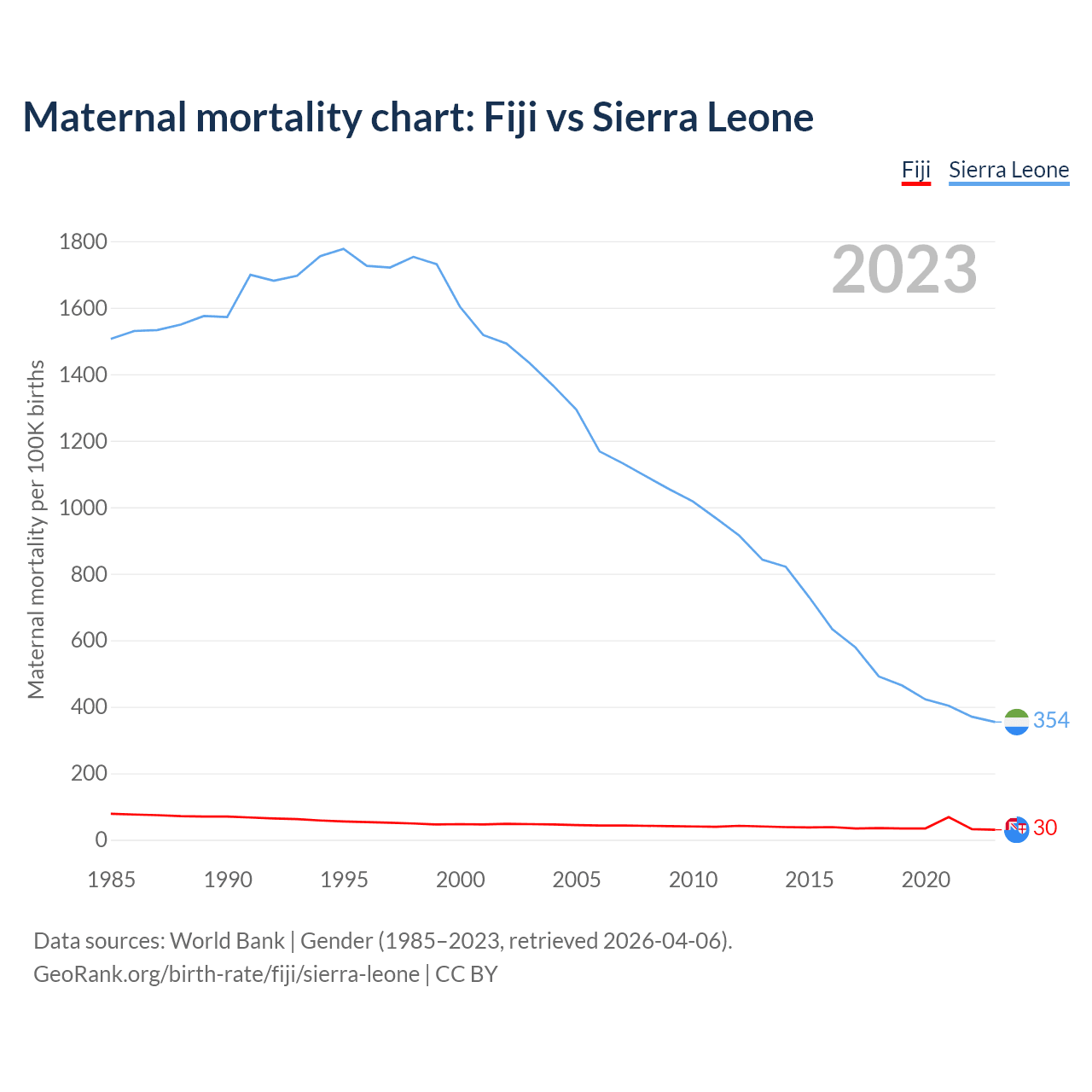 The maternal mortality rate, which is the probability of dying during childbirth or within 42 days of pregnancy termination, is 30 deaths per 100,000 live births in Fiji, compared to 354 deaths in Sierra Leone.