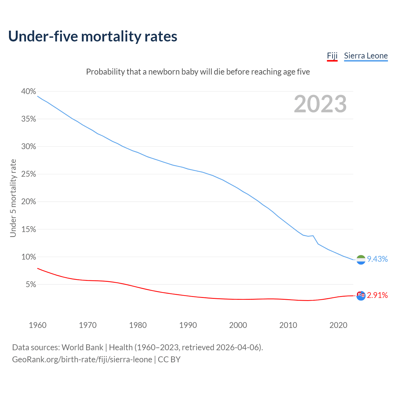 The chance that a newborn baby will die before reaching age five is 2.91% in Fiji and 9.43% in Sierra Leone. Above is a chart with historical data on under-five mortality rates.