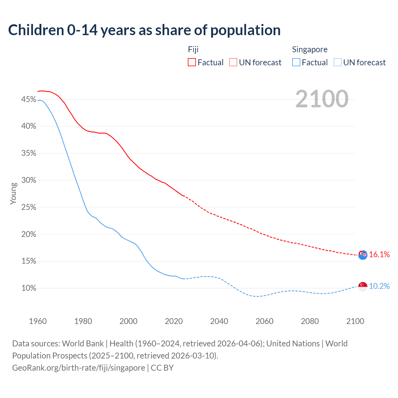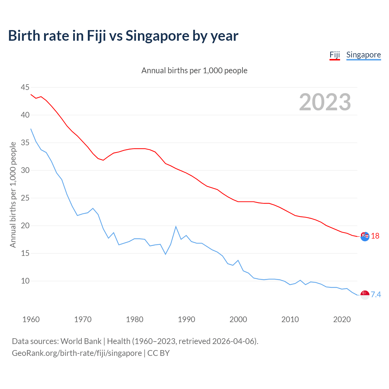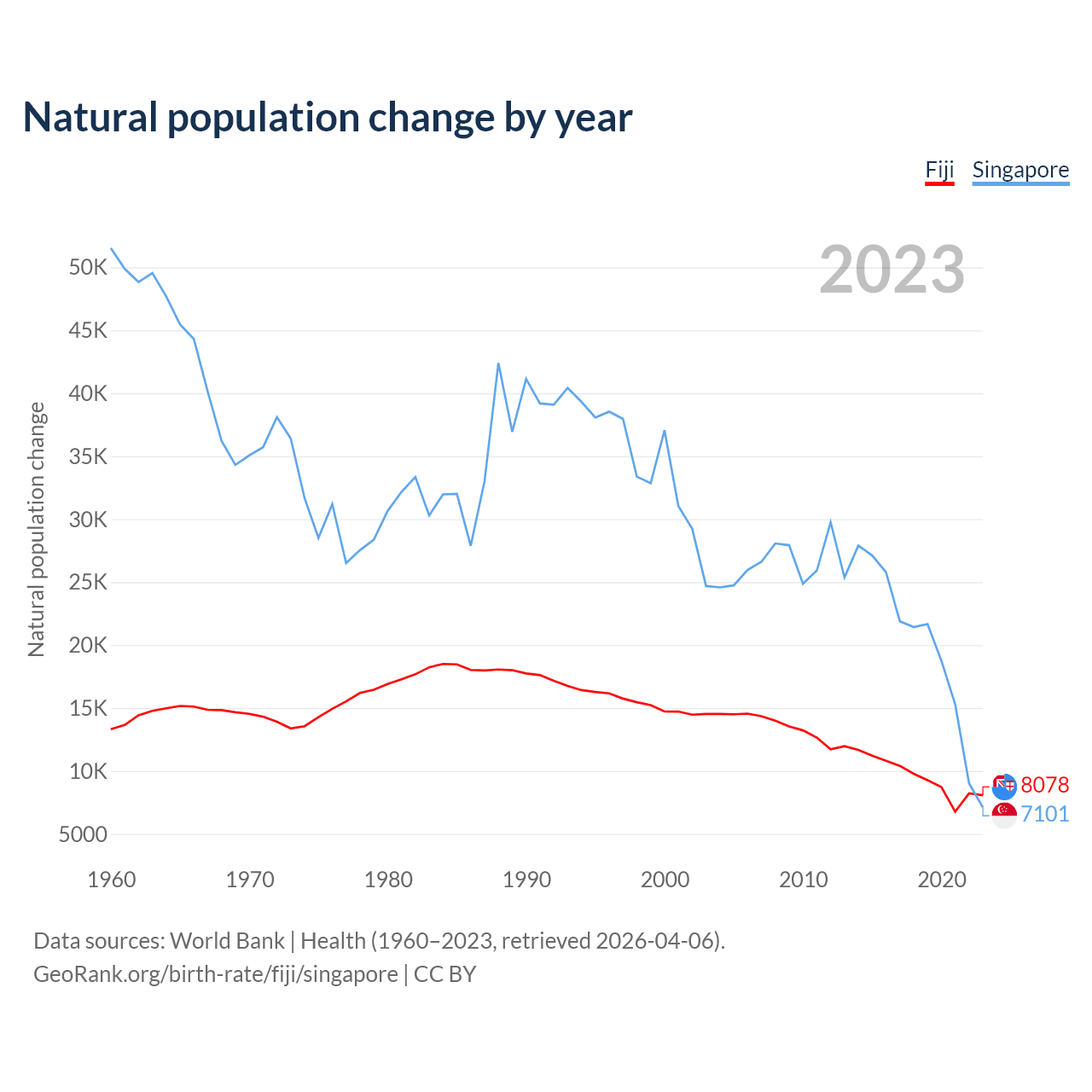 According to the latest available data on birth rates, the fertility rate in Fiji was 2.28 children per woman in 2023, compared to 0.97 in Singapore in 2023. The replacement level is considered to be 2.1 children per woman.