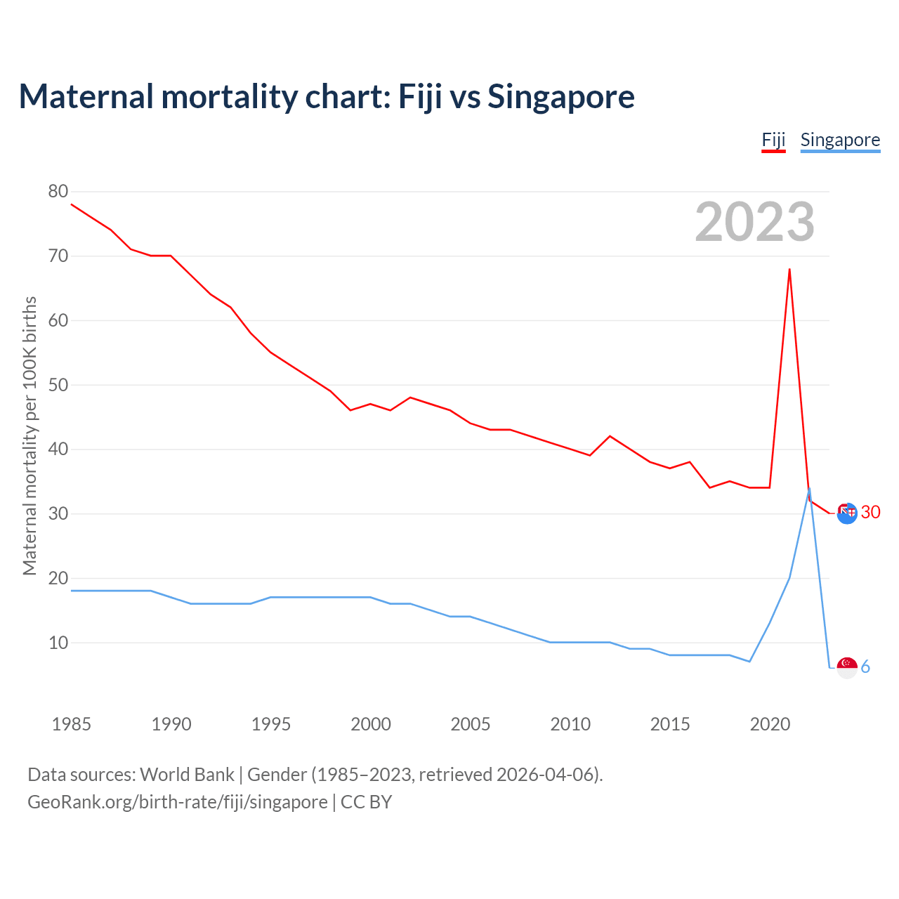 The maternal mortality rate, which is the probability of dying during childbirth or within 42 days of pregnancy termination, is 30 deaths per 100,000 live births in Fiji, compared to 6 deaths in Singapore.