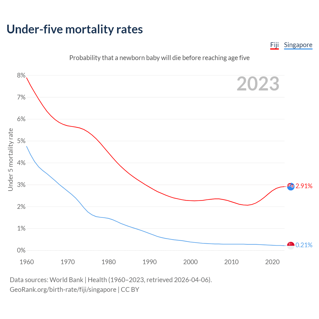 The chance that a newborn baby will die before reaching age five is 2.91% in Fiji and 0.21% in Singapore. Above is a chart with historical data on under-five mortality rates.