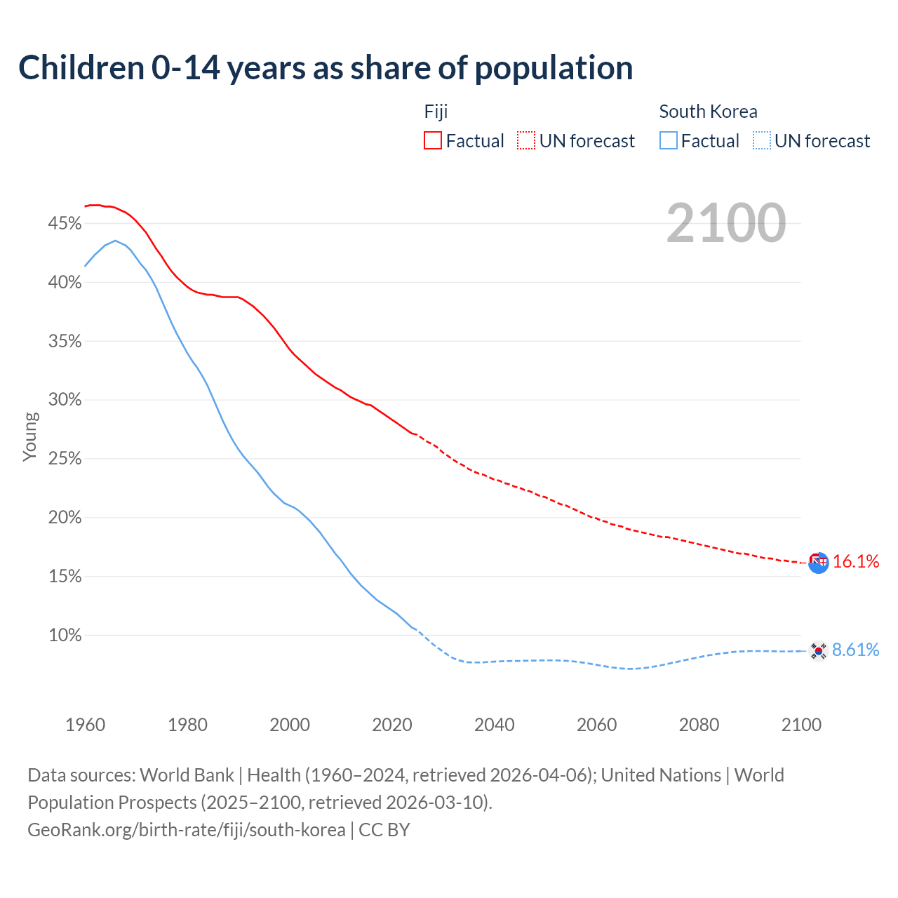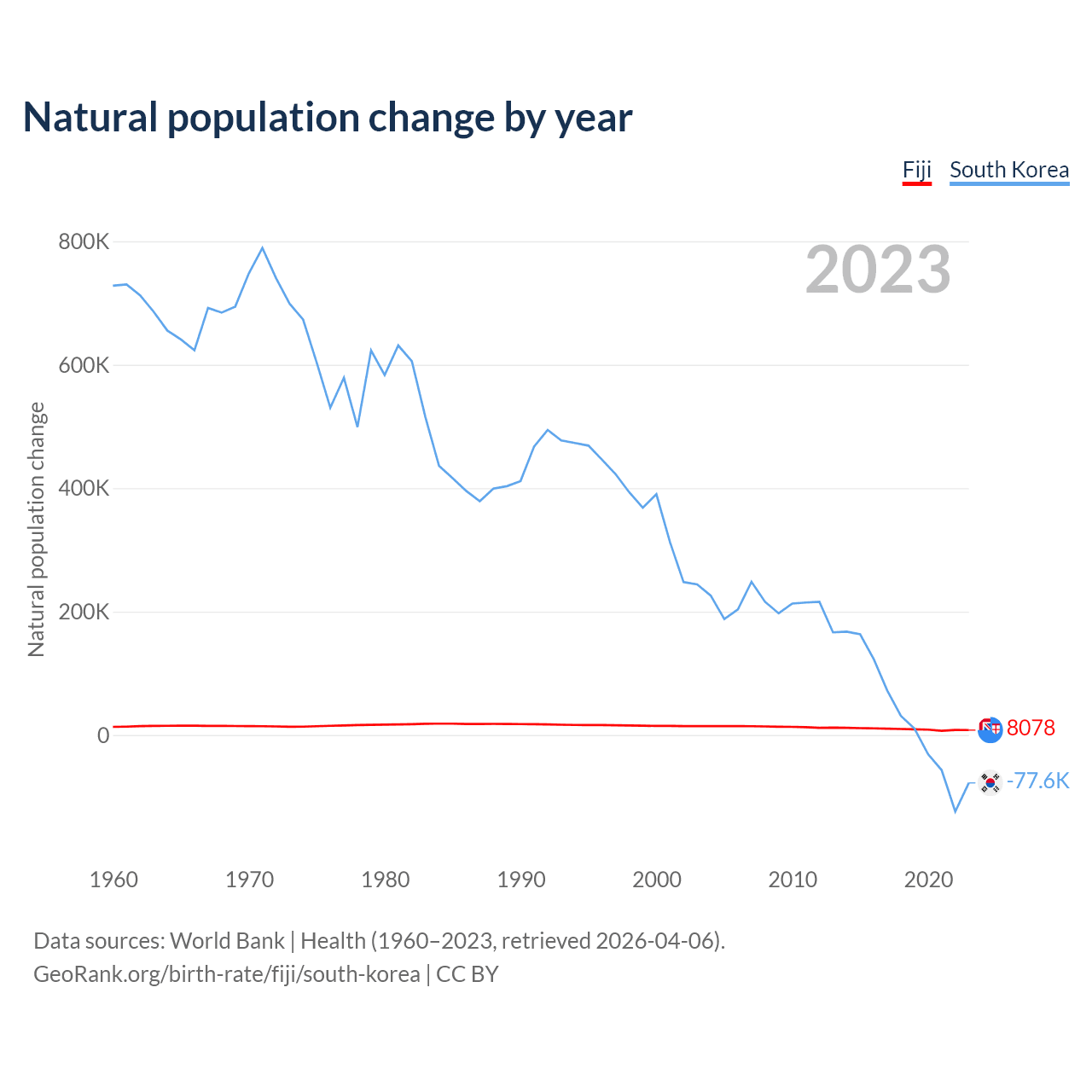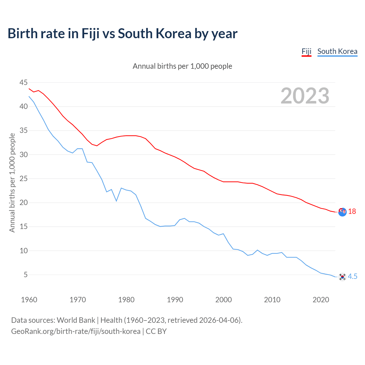 According to the latest available data on birth rates, the fertility rate in Fiji was 2.28 children per woman in 2023, compared to 0.72 in South Korea in 2023. The replacement level is considered to be 2.1 children per woman.