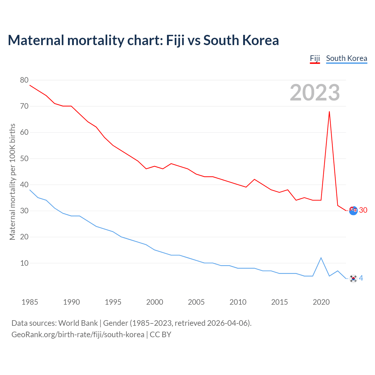 The maternal mortality rate, which is the probability of dying during childbirth or within 42 days of pregnancy termination, is 30 deaths per 100,000 live births in Fiji, compared to 4 deaths in South Korea.
