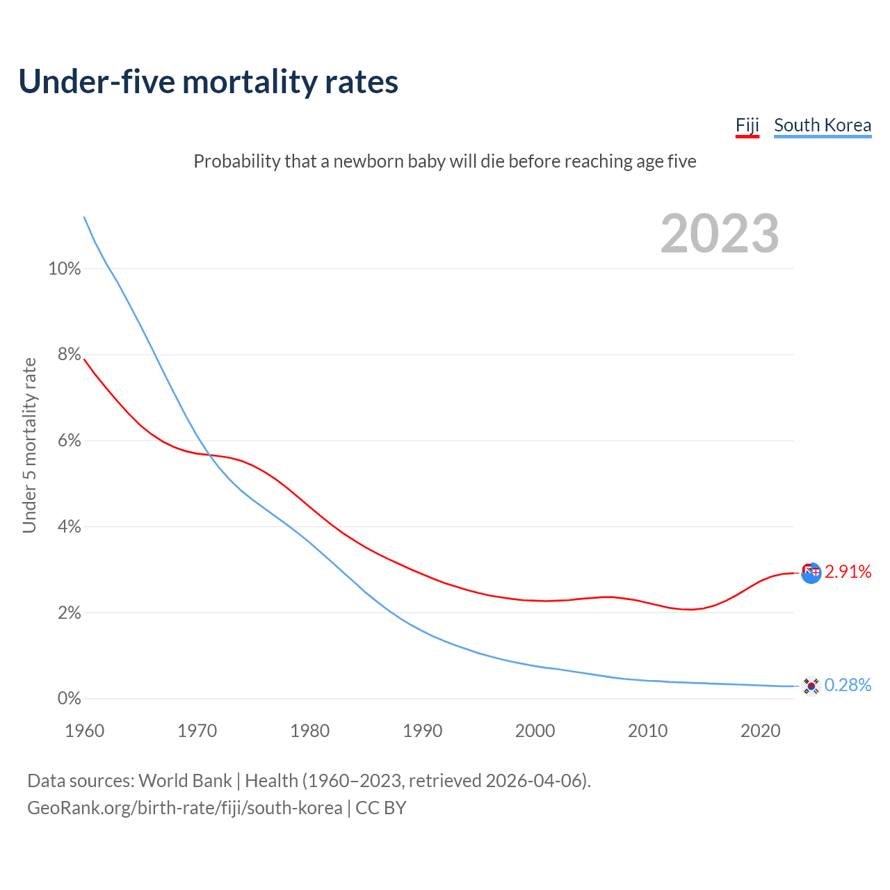 The chance that a newborn baby will die before reaching age five is 2.91% in Fiji and 0.28% in South Korea. Above is a chart with historical data on under-five mortality rates.