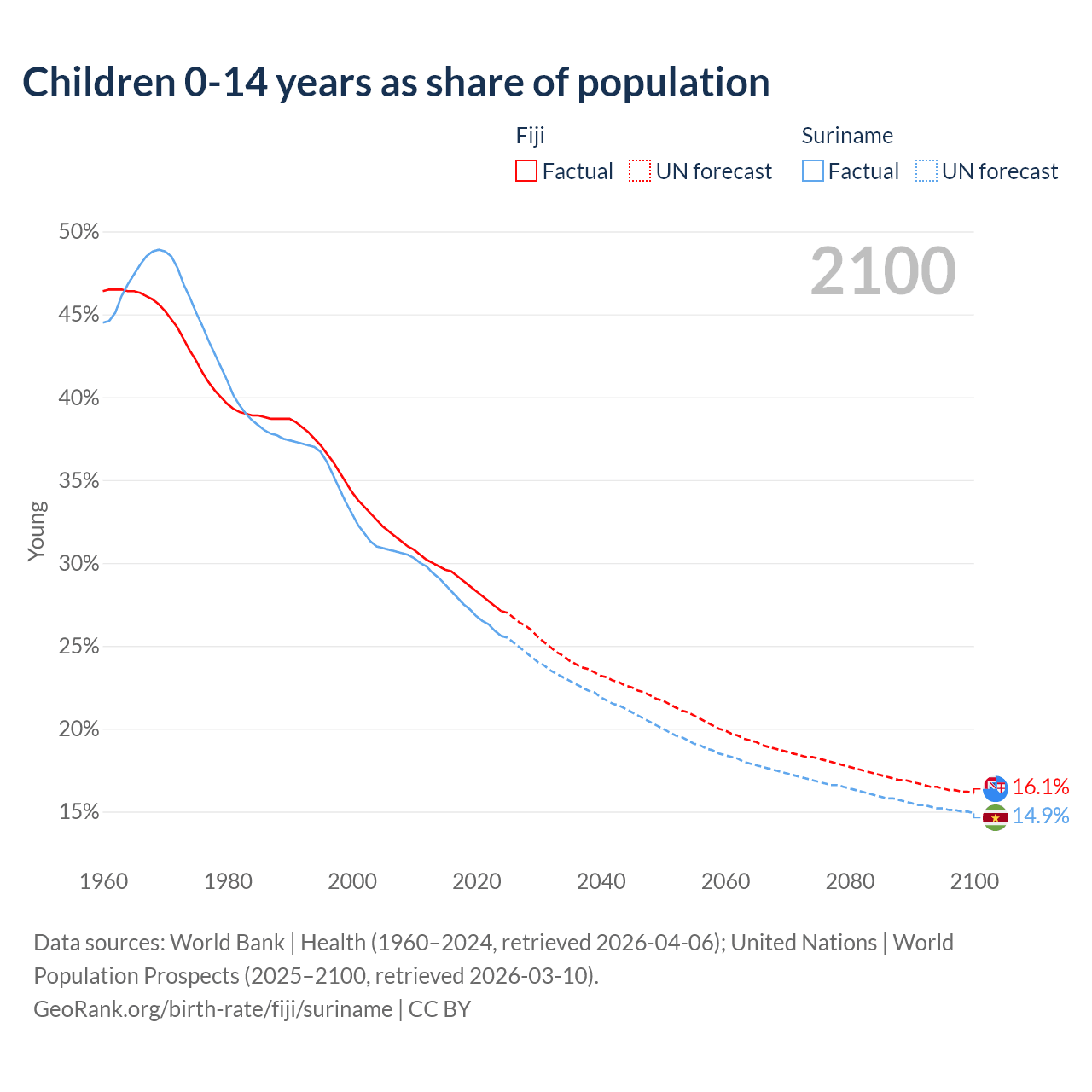 According to the latest available data on birth rates, the fertility rate in Fiji was 2.28 children per woman in 2023, compared to 2.25 in Suriname in 2023. The replacement level is considered to be 2.1 children per woman.