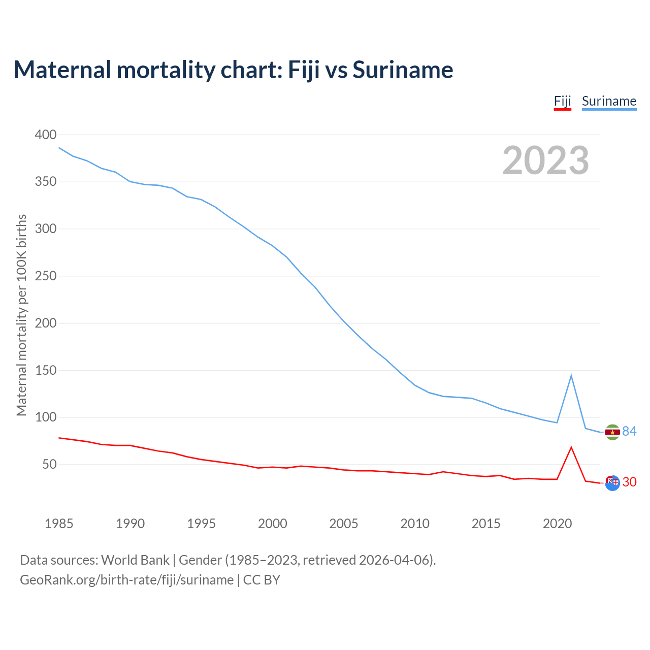 The maternal mortality rate, which is the probability of dying during childbirth or within 42 days of pregnancy termination, is 30 deaths per 100,000 live births in Fiji, compared to 84 deaths in Suriname.