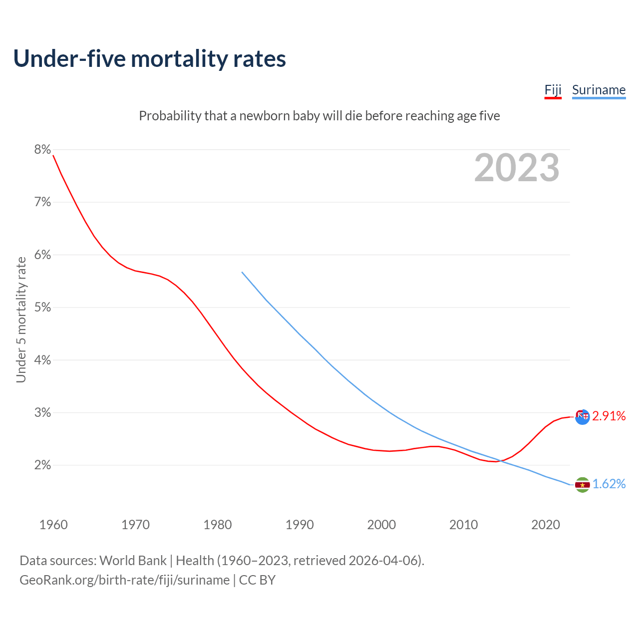 The chance that a newborn baby will die before reaching age five is 2.91% in Fiji and 1.62% in Suriname. Above is a chart with historical data on under-five mortality rates.